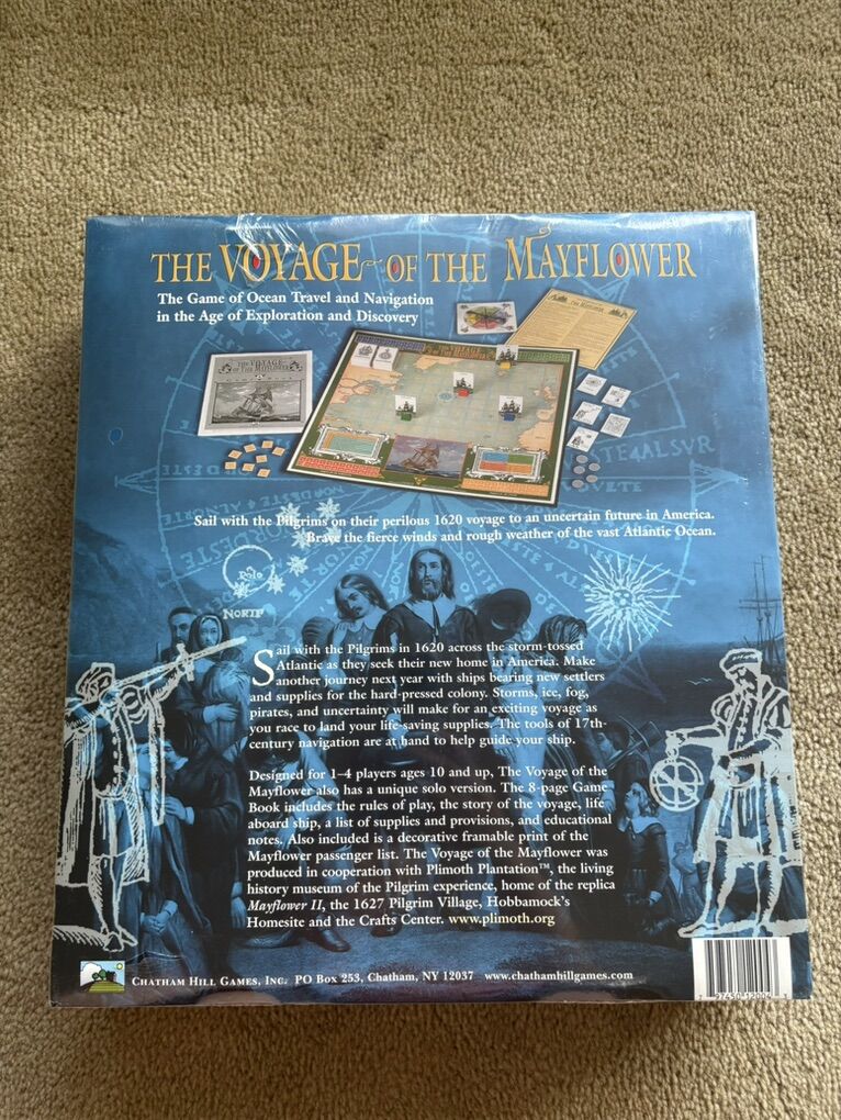 NEW (sealed in plastic) The Voyage of the Mayflower Ocean Adventure Game. Sail with the Pilgrims on their perilous 1620 voyage. Chatham Hill Games, developed in cooperation with Plimoth Plantation. Ages 10+. New, unopened condition. Box slightly dented. Text only. Cash or Venmo.