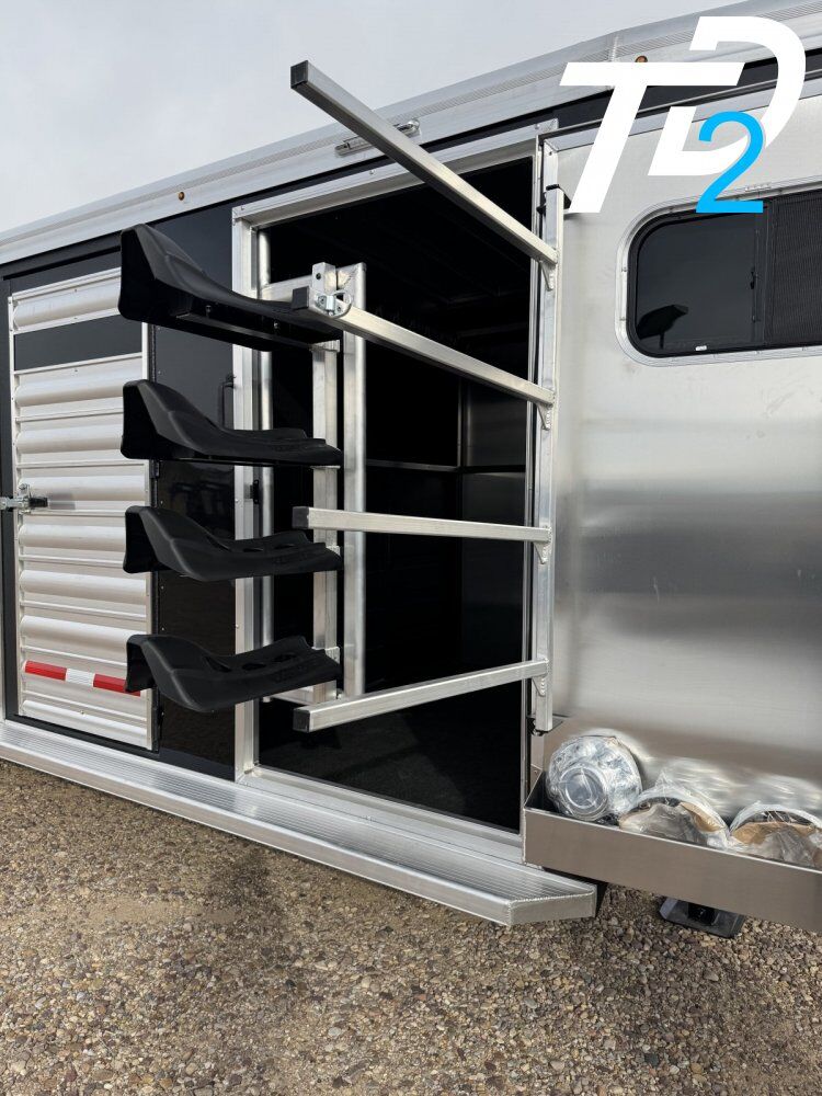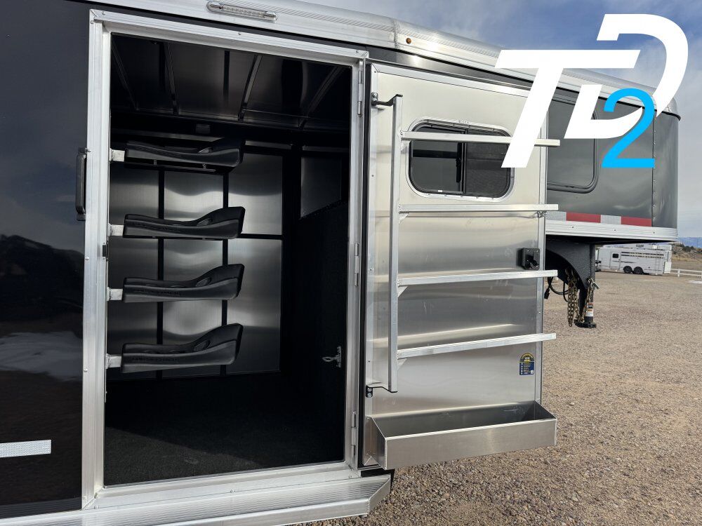 WhizProof Slatted Floor w/ Sure Grip Permanent Rubber 4-Tier Swing-out Saddle Rack; 4-Tier Blanket Rack; 12 Bridle Hooks; Aluminum Brush Box on Door; Aluminum Clothes Rod One Full Center Cut Gate Tie Rings - Stall area (Continuous One-Piece) and Exterior (5) Reverse / Backup Lights - Wire Porch Light so they come on when tow vehicle is in reverse