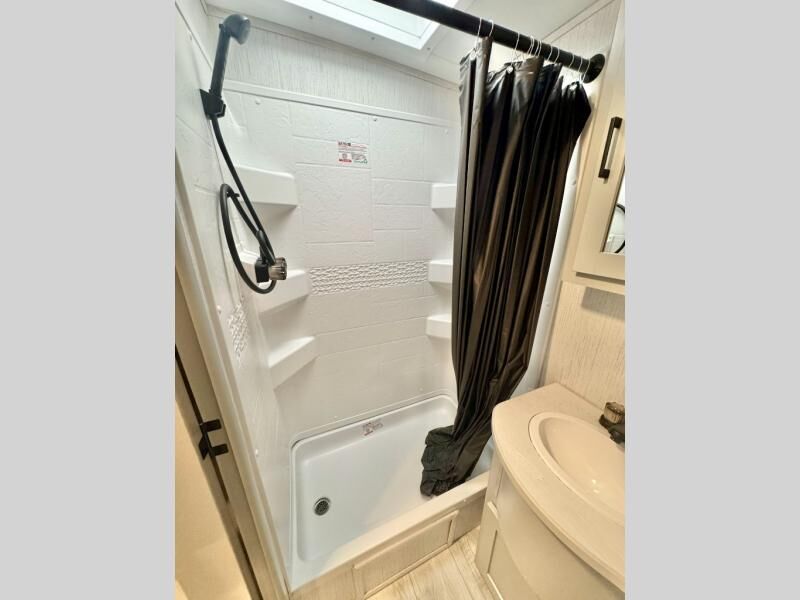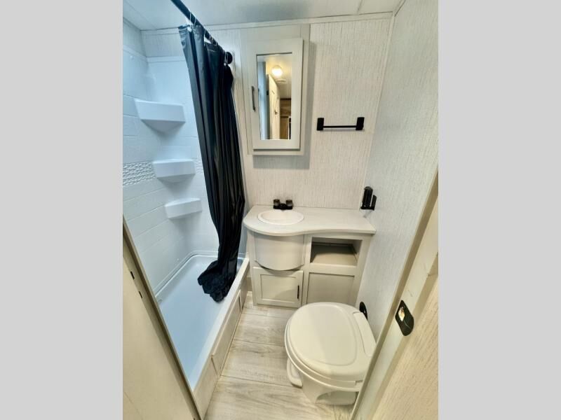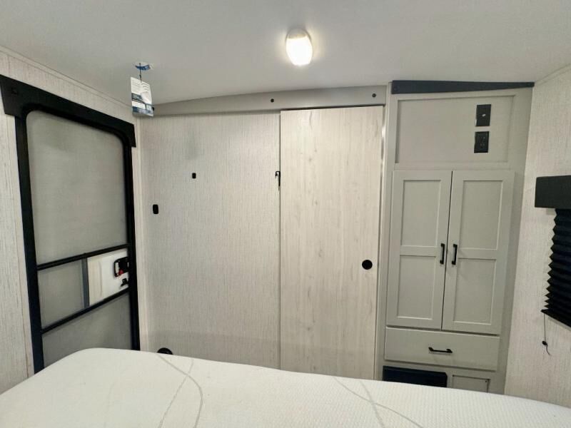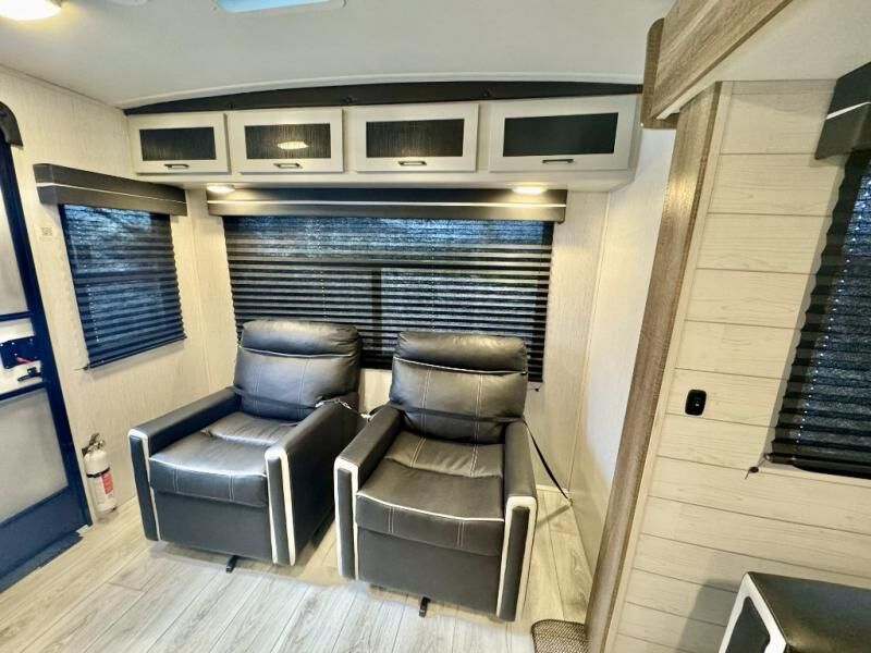 Plan to stay awhile in this comfortable travel trailer that will feel like home! The rear living area includes dual lounge chairs so you can relax after a day outdoors, plus there is a booth dinette and a sofa here for additional seating space. Your guests can make their beds here at night, and you can take the king bed in the front private bedroom. This model features convenient dual entry doors for a smooth flow of traffic, and there is plenty of storage space for all your belongings.