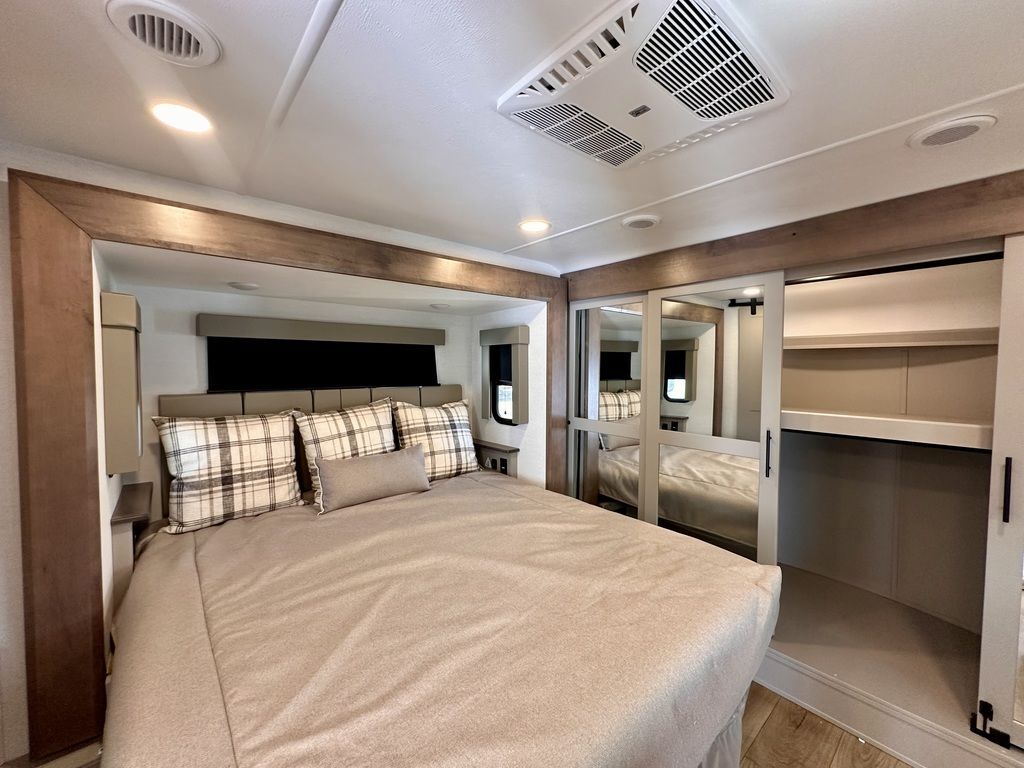 Alliance RV Valor toy hauler 44V14 highlights: Loft Bath and a Half Fireplace Dual Entry Doors Roll-Over Sofas 14' Garage The whole gang will love camping in this toy hauler with a14' garagefor your toys and gear. Once you have arrived at your destination, you can set up the HappiJac roll-over sofas with a queen bed above them, and also aloft which opens to the garage area as well. A half bathis also available off the garage which is an added convenience for those sleeping in this converted area, and for those coming in off the trail so that they do not have to track all through the main unit to use the bathroom. The chef can prepare great meals for their hungry crew with the fully equipped kitchen including a four burner cooktop, astainless steel 12V refrigerator, large sink, and plenty of countertop prep space. The rest of the gang can be relaxing on the large L-shaped sofa slide watching the 50" HDTV and enjoying the fireplace, or playing a game of cards at the dining table with four chairs. The front private bedroom features a king bed slide for more interior space, a flip top dresser for all of your belongings, and a front wardrobe with washer and dryer prep, plus it has an entrance into the dual entry bathroom! You can bring your toys with you wherever you go with any one of these Alliance RV Valor toy hauler fifth wheels! They are adventure-ready with a quality build from the walk on roof with seamless PVC roof covering to the commercial grade vinyl flooring and MorRyde CRE3000 suspension system. The Performance Running Gear package comes with a 101" wide-body benchmark chassis platform, 7,000 lb. Dexter axles, and a space enhancing drop frame storage compartment to pack in all your riding gear. You can even go off-gridding thanks to the Off the Grid Pack that has two 400 watt solar panels, generator prep, a 40 amp charge controller, and a 100 amp hour lithium iron phosphate battery. Some of the interior comforts you will enjoy are the hardwood cabinet doors and drawers, solid surface kitchen countertops, and commercial grade vinyl flooring with no carpet to make clean up a breeze. The Valor toy haulers are also the Master of 12 Volt with USB charging station throughout, a stainless steel refrigerator, and more 12 volt features to make camping hassle-free!