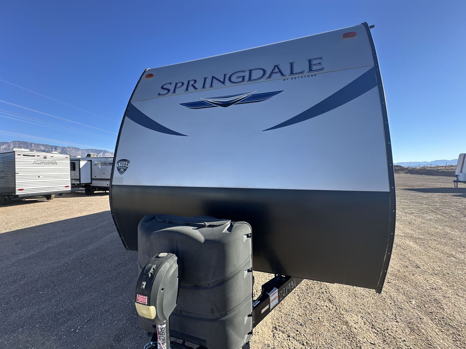 Keystone Springdale travel trailer 222RDWE highlights: Semi-Private Bedroom Full Bathroom Sofa Booth Dinette Let your adventurous spirit be completely cared for with this Springdale! This trailer is compact enough to get to the campsite easily, yet it contains everything you need to have an enjoyable getaway without feeling like you're "roughing it." A queen bed is in the front of this trailer so that you can have some privacy while you sleep or get ready for the day, and a sofa and booth dinette in the back provide comfortable seating space for you and your family or friends while you eat a meal or use the entertainment center. You will also be happy to find a pantry so that you can store your favorite goodies for any late-night snacking. With any Keystone Springdale travel trailer, fifth wheel and destination trailer, you will appreciate the 12V color-coded wiring with easy-to-trace circuits which is better than conventional RV wiring allowing a faster diagnosis for quicker repairs. Also included, the Blade high performance air flow system that delivers 30% more air flow and the streamlined heat distribution that uses in-floor heat vents for more efficiency for uninterrupted air flow. Some exterior features include theLCl SolidStep for a sturdy entrance, the pass-through storage compartment for larger outdoor gear, and Dexter E-Z Lube axles. The interior offers designer upholstered window valances, pressed kitchen countertops, and much more depending on the Springdale you choose.