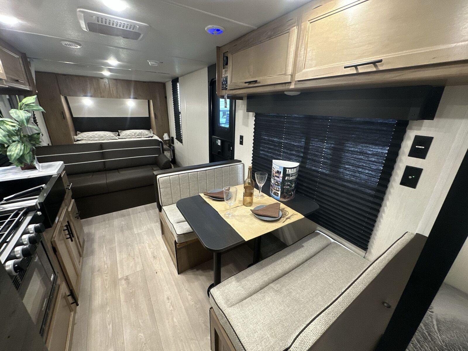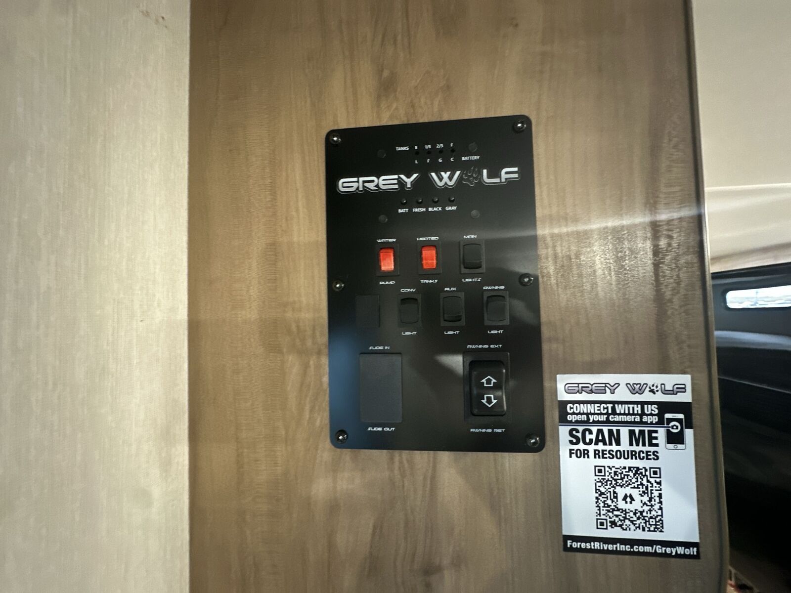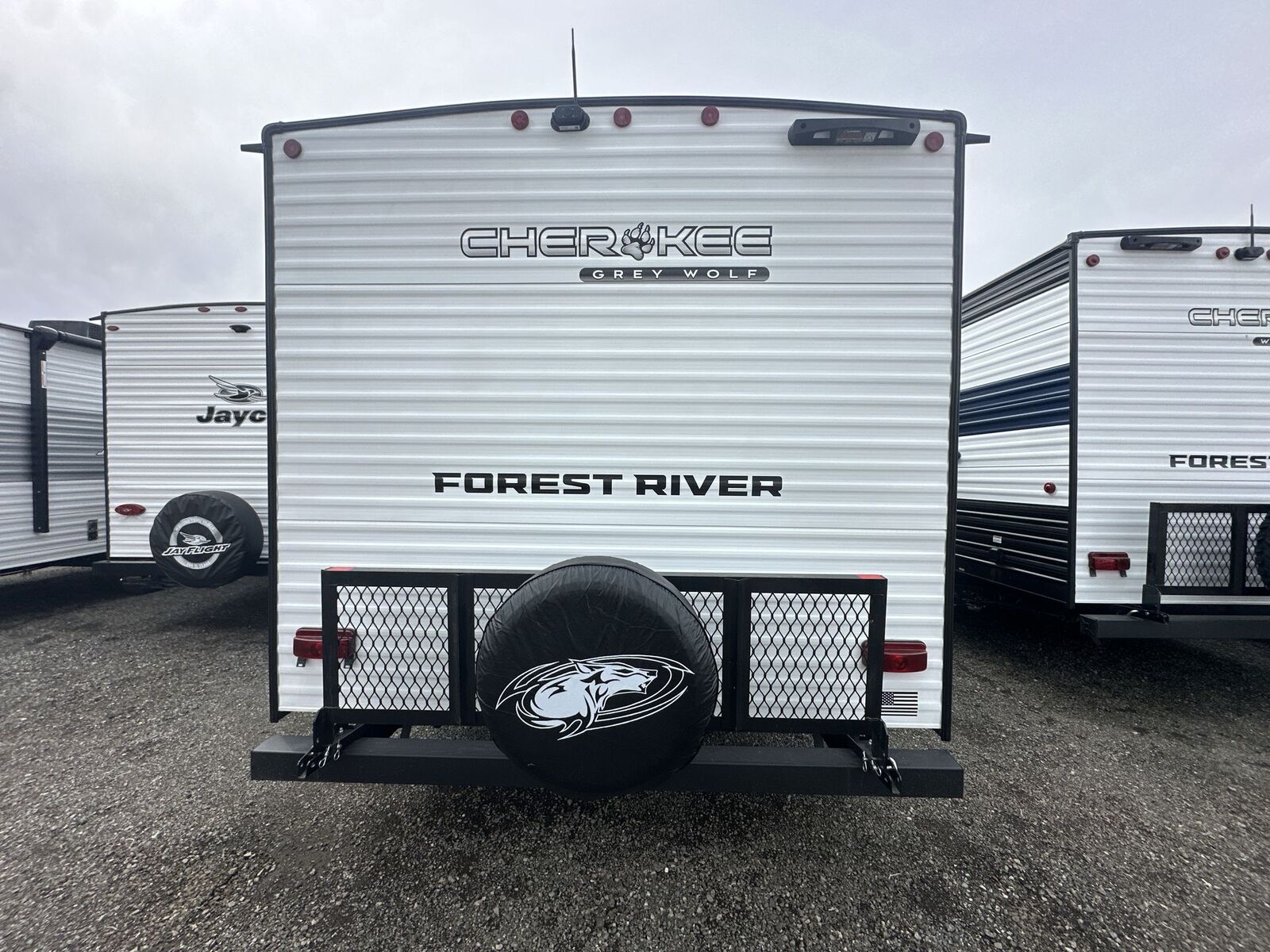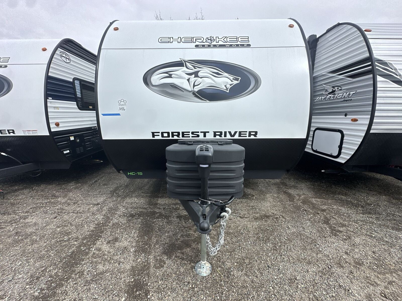 Forest River Cherokee Grey Wolf travel trailer 26DJSE highlights: Walk-Around RV King Bed Rear Storage Rack Full Bath Air Fryer If you like to camp with more friends and family, this travel trailer is for you! Since there are double-size bunks, a queen bed, plus a sofa and booth dinette, you can sleep eight people each night! The front bedroom includes the RV king bed, along with dual bedroom wardrobes and USB ports to charge your phones overnight. A full kitchen, complete with an air fryer and refrigerator will let the chef do their thing, and everyone can head outdoors to sit under the 15' patio awning! Whether it's a journey that will take you to new locations or a tried-and-true getaway to that favorite and memorable destination, the Forest River Cherokee Grey Wolf travel trailers and toy haulers are going to make the trip worth it every single time! You can travel in confidence with the premium wheel package, seamless roofing membrane with heat reflectivity, Power Gear frame technology with space-saver rail design, and Cherokee back-up camera system. The Cherokee Grey Wolf's interior is highly attractive with its stainless steel kitchen suite package and premium bedding ensemble and comforter. You will also find a black waste tank flush-out kit, an outside shower with hot and cold water, an armored underbelly tank enclosure, and an RV grill quick connect.