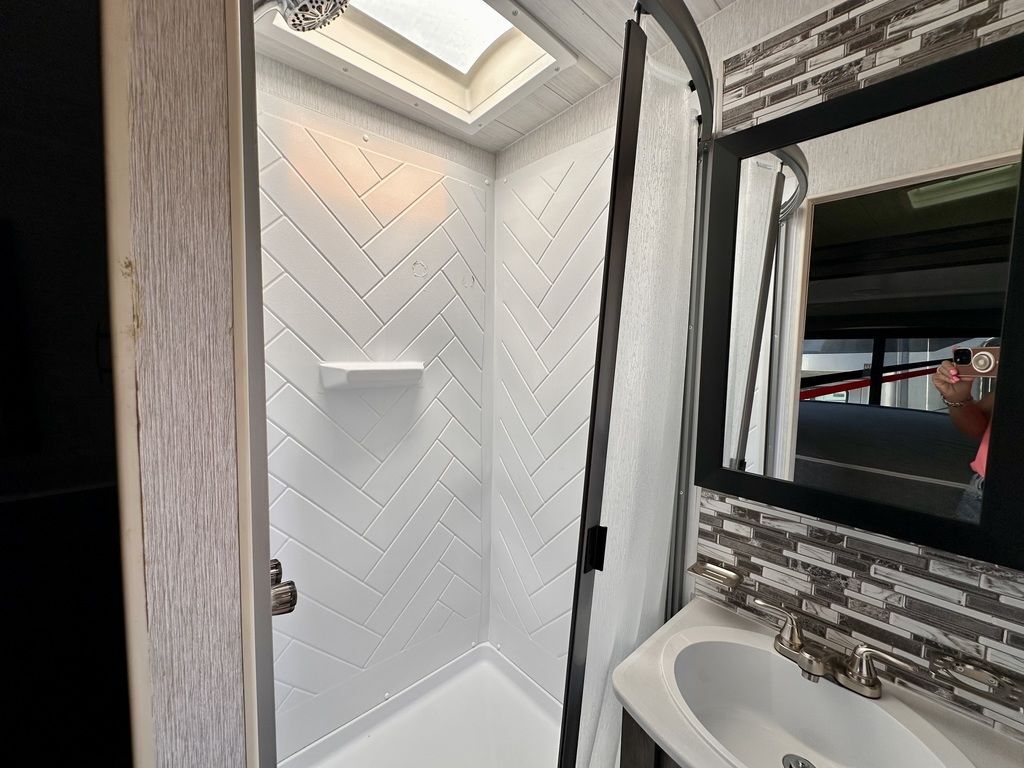 Forest River Shockwave DX Series toy hauler 26SGDX highlights: Electric Pass-Through Dinette 16' Cargo Space Slide Out King Bed Outside Storage Pantry Double Door Refrigerator Are you looking for the perfect RV that can haul your favorite ride-on toys to the lake? This toy hauler travel trailer is spacious with its 16' cargo space, plus it can sleep six people comfortably each night. You and another will love the master bedroom that includes a slide out king bed plus a dresser vanity with a mirror. The walk-through bath is accessible from the bedroom and the main living area for your guests. Relax on the two chairs with a table or play a game of card on the electric pass-through dinette. There is also an electric bed that will be perfect for extra overnight guests! Each Forest River Shockwave DX Series and MX Series travel trailer toy hauler includes a wide body construction, super lube axles, plus an outside shower so you can wash off your riding boots. Inside, you'll enjoy the black chef's high-rise spring faucet make clean-up a breeze, and the 13,500 BTU A/C will keep you cool on those hot summer months. Each model also includes a drive on wheel well on the doorside, a 35 gallon fuel station, plus LED marker and clearance lights to make parking your trailer easier than ever.