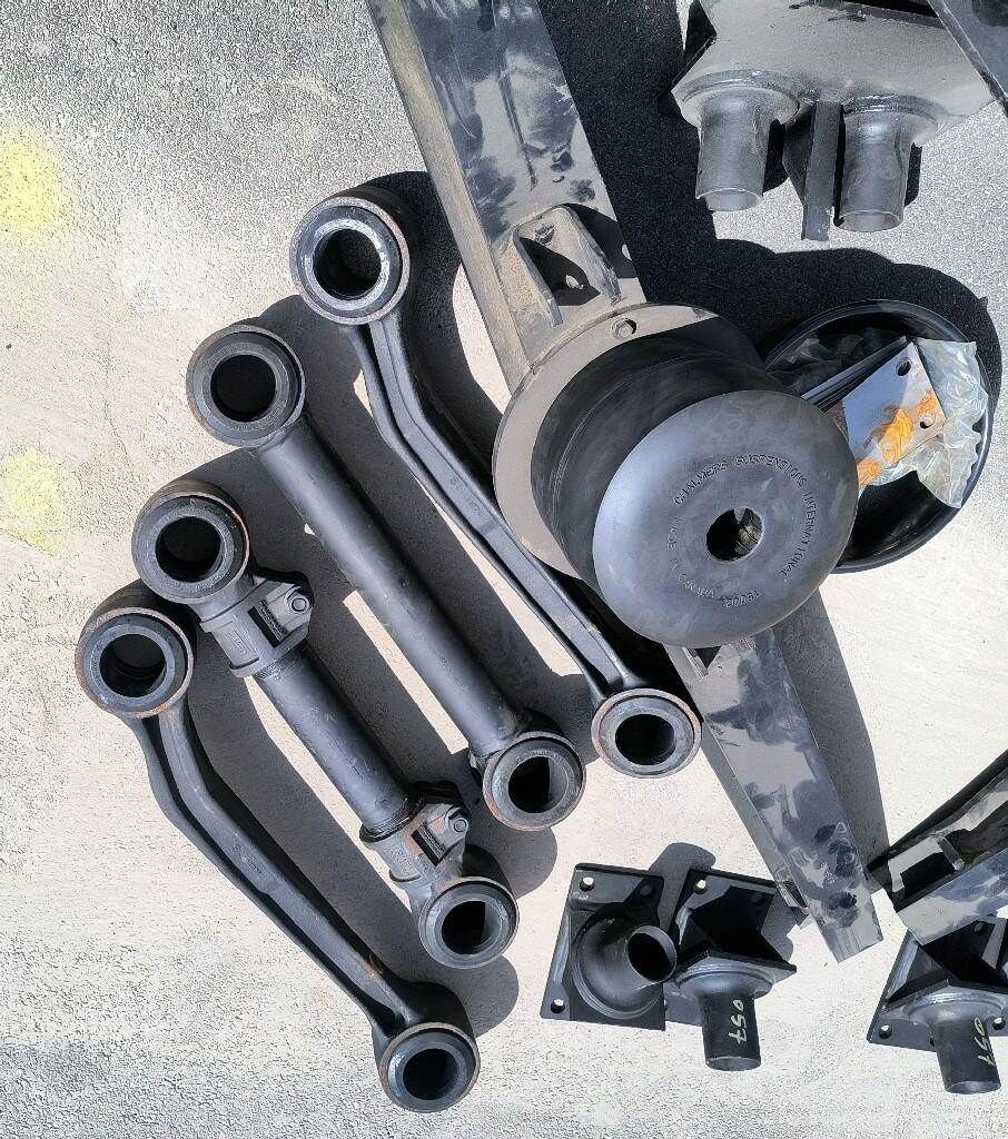 CHALMERS 800 SERIES SUSPENSION 50000 LBS, 54" QTY 2) 800688 BEAM-WALKING, 2) 850212 FRAME-TRIANGULAR 4) 800057 BRACKET-TORQUE ROD FRAME, 2) 373029 CAN-RESTRICTOR #29, 16) 800055 CAP-SPIGOT 4) 800049 ROD-TORQUE 2) 80512 ARM-TORQUE 12 DEGREE 21 5/8 2) 807214 T-ROD 2) 15002 SPRING-RUBBER 8) SHIMS, BAGS OF BOLTS