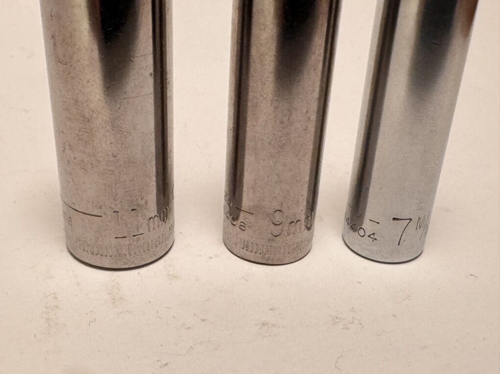 They are a 11mm 9mm and 7mm. Take all three 1/4 drive chrome finished sockets for $5 total.