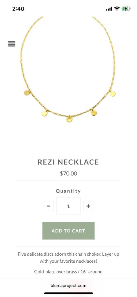 I have a new Rezi gold tone necklace with 5 small discs hanging from it. It is just 16 inches long so it hangs just longer than a choker. The price tag shows it was originally $66. The last picture shows the same necklace online for $70. The description says it is gold-plate over brass. See my other ads for jewelry, artwork, home decor and more.