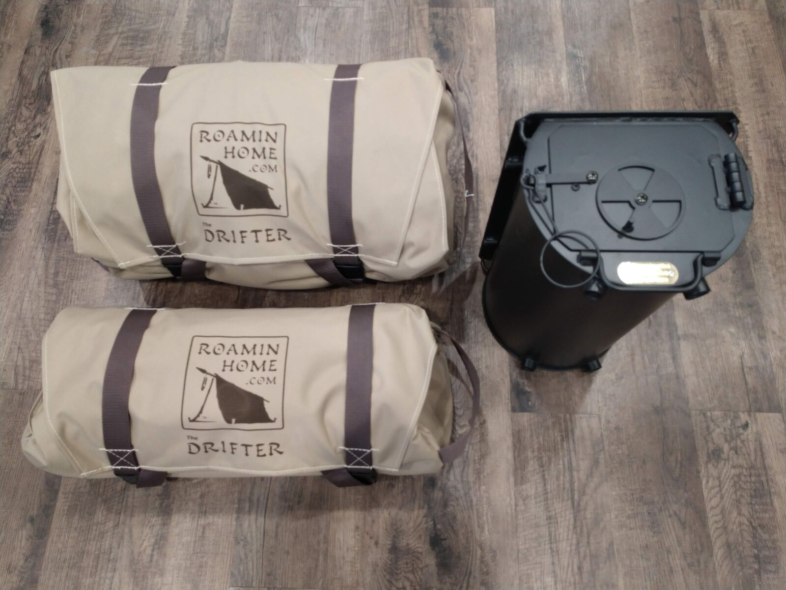 -Drifter tent- 10’ x 8’ footprint 10 oz sunforger canvas Aluminum pole set included 2 large windows Extra wide door Utility loops Sod cloth Stove jack Pole hook Guy line ropes Spikes and spike bag. Hammer Instruction book 2 storage bags