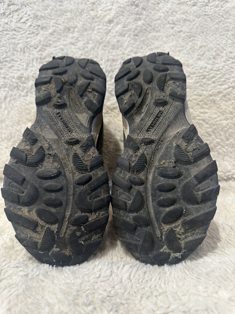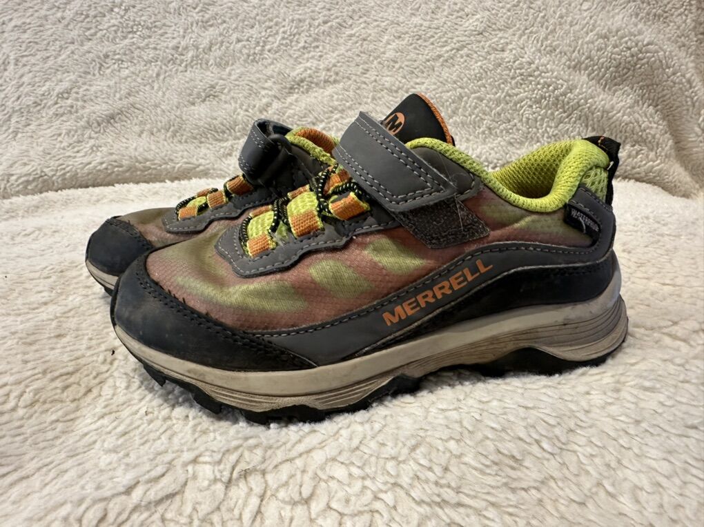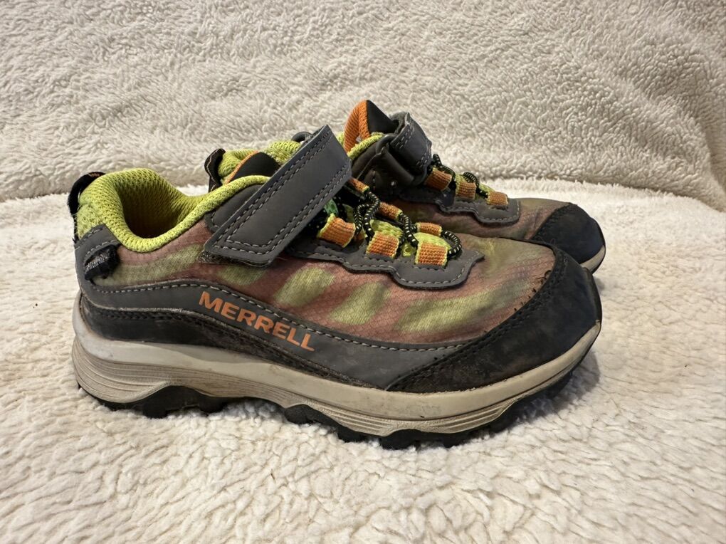 Merrell toddler size 12 gray/yellow/orange waterproof, hiking shoes with elastic laces and a Velcro strap at the top. These are in good condition, see photos for details. I take cash or Venmo, but cash is preferred. Text is best. 801-201-4446.Check out my other ads for additional sizes and styles.
