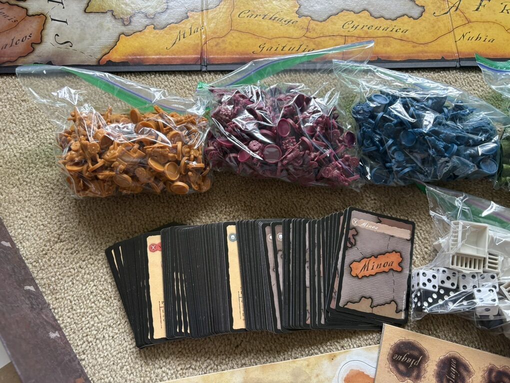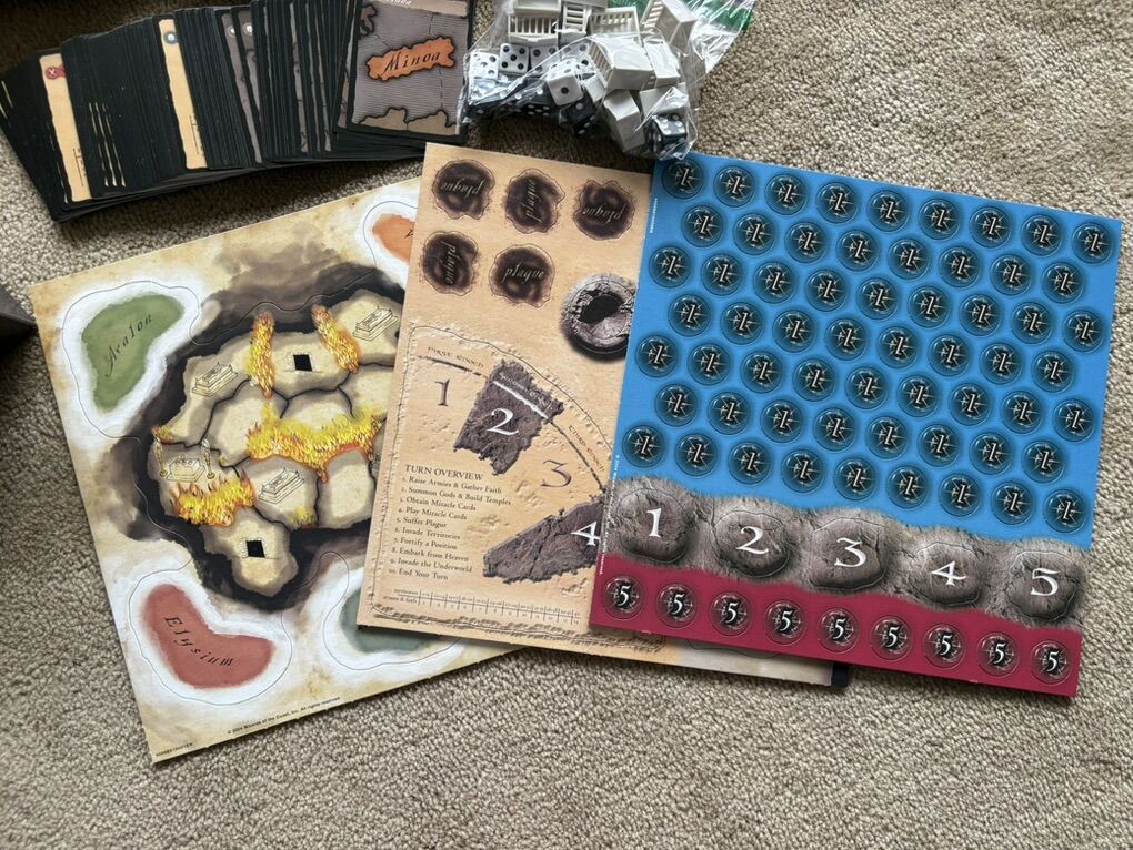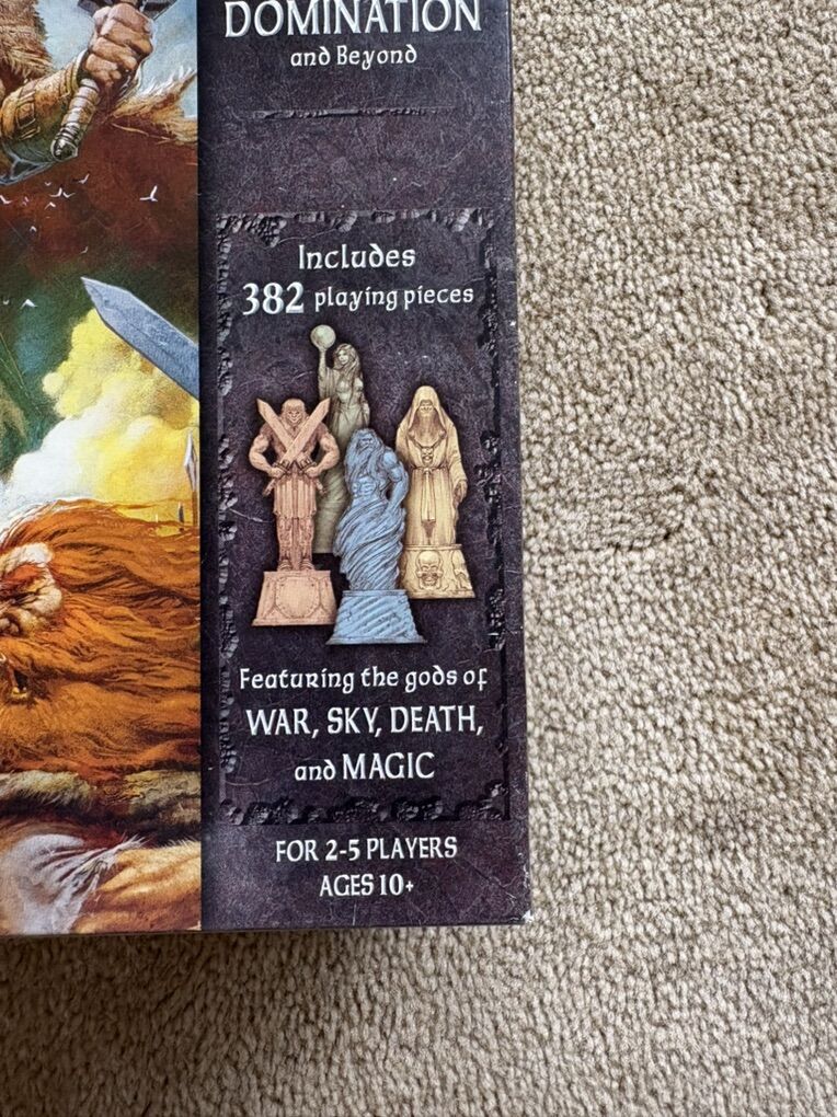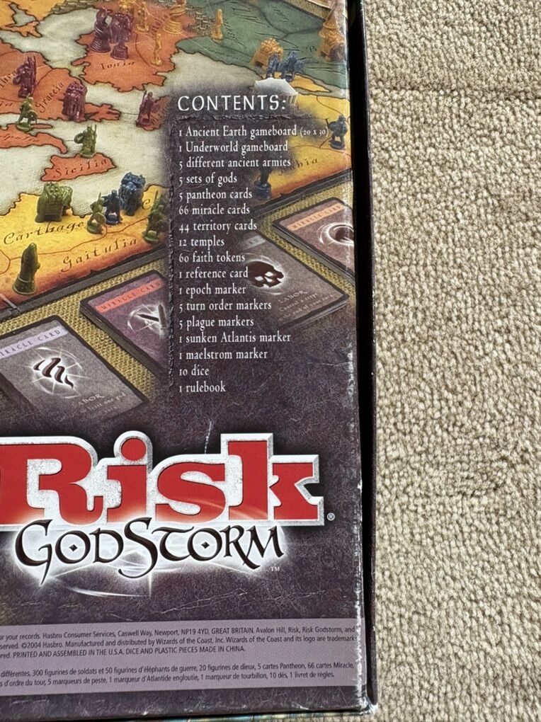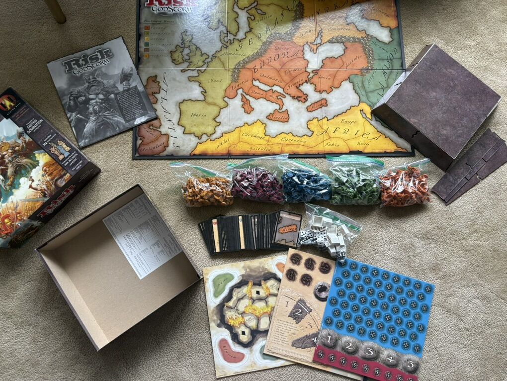 COMPLETE RISK: Godstorm. The game of earthly domination and beyond. The classic game of RISK takes on mythical proportions. 2-5 players, ages 10+. Avalon Hill, Wizards of the Coast, 2004. Complete, no missing pieces. Very good condition. Box corners slightly worn. Substantial, high-quality game. Text only. Cash or Venmo.