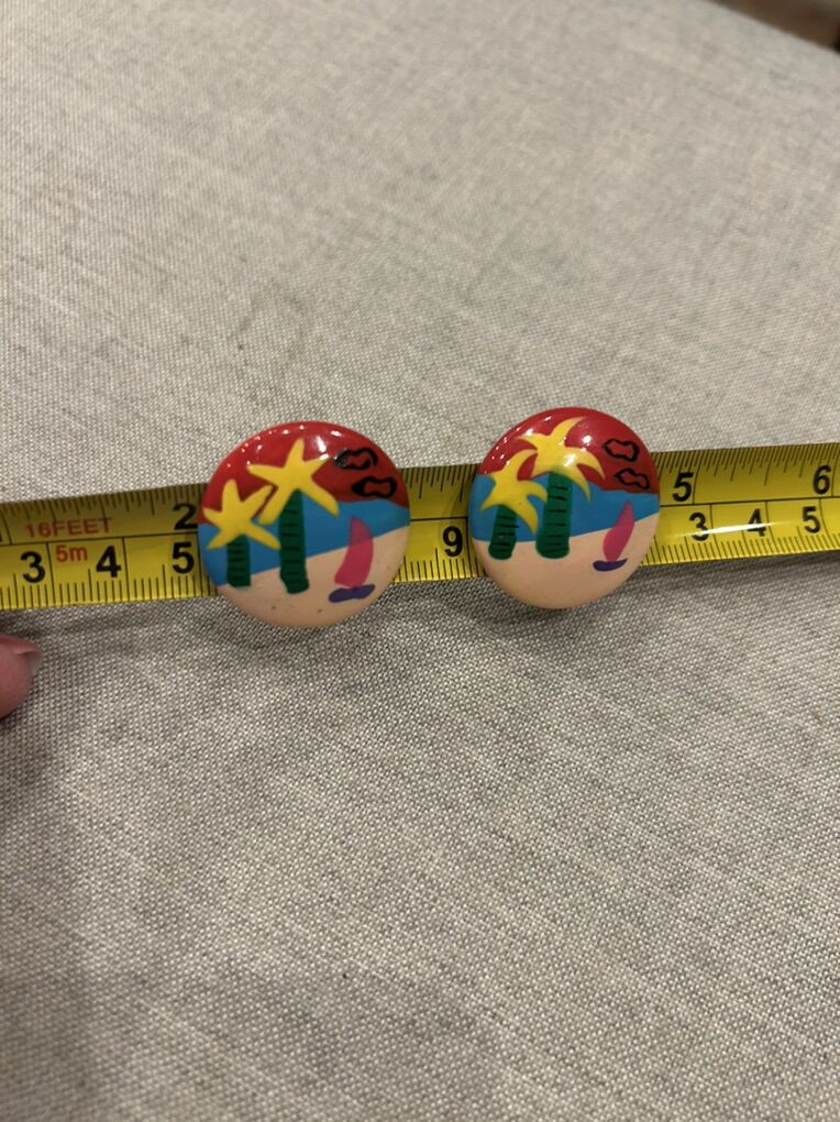 VenmoAdorable Vintage hand painted clip on earrings. Tropical scene with beach and two palm trees, ocean, clouds, and a sailboat. Lightweight. Clean smoke free home. Cash or Venmo. Pick up from Alpine.