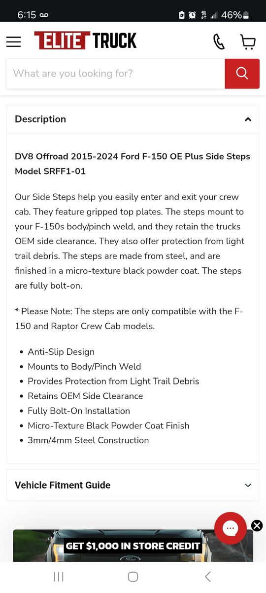 Sweet set of DV8 Offroad side steps. These are for a Ford F-150 and Raptor crew cab models from 2015 to 2024. These are in like new condition. There are a couple of minor blemishes. I do not have the mounting bolts. For further description, see the pictures and look them up. Asking 150.00. Thanks for looking, text is best 435-881-6391