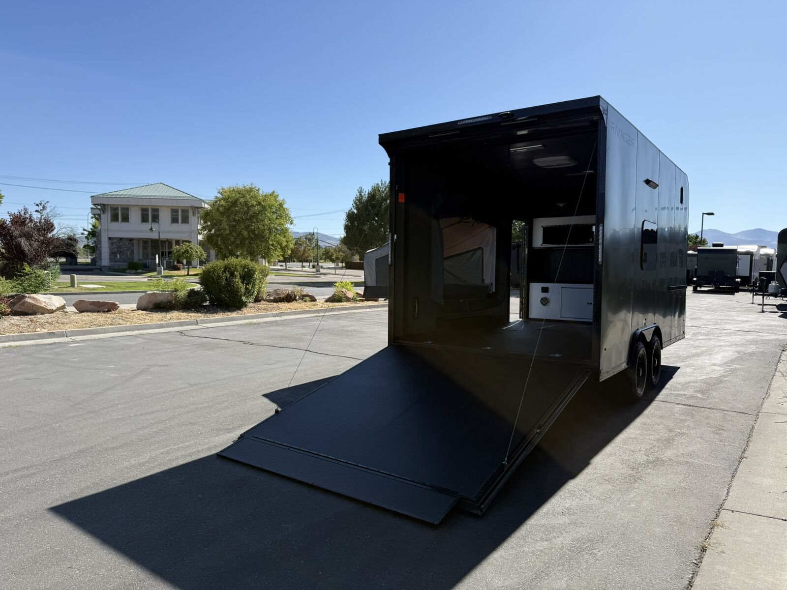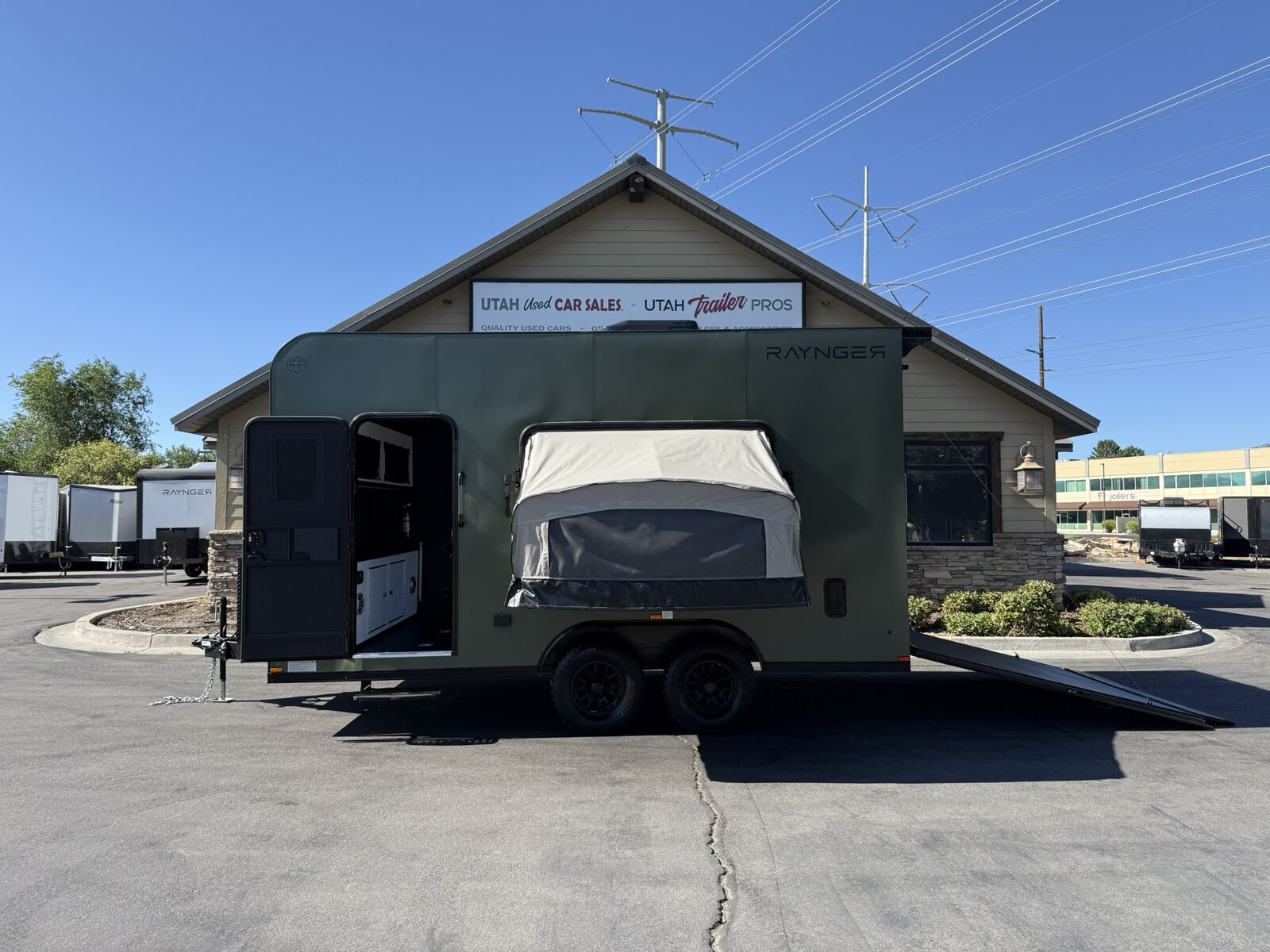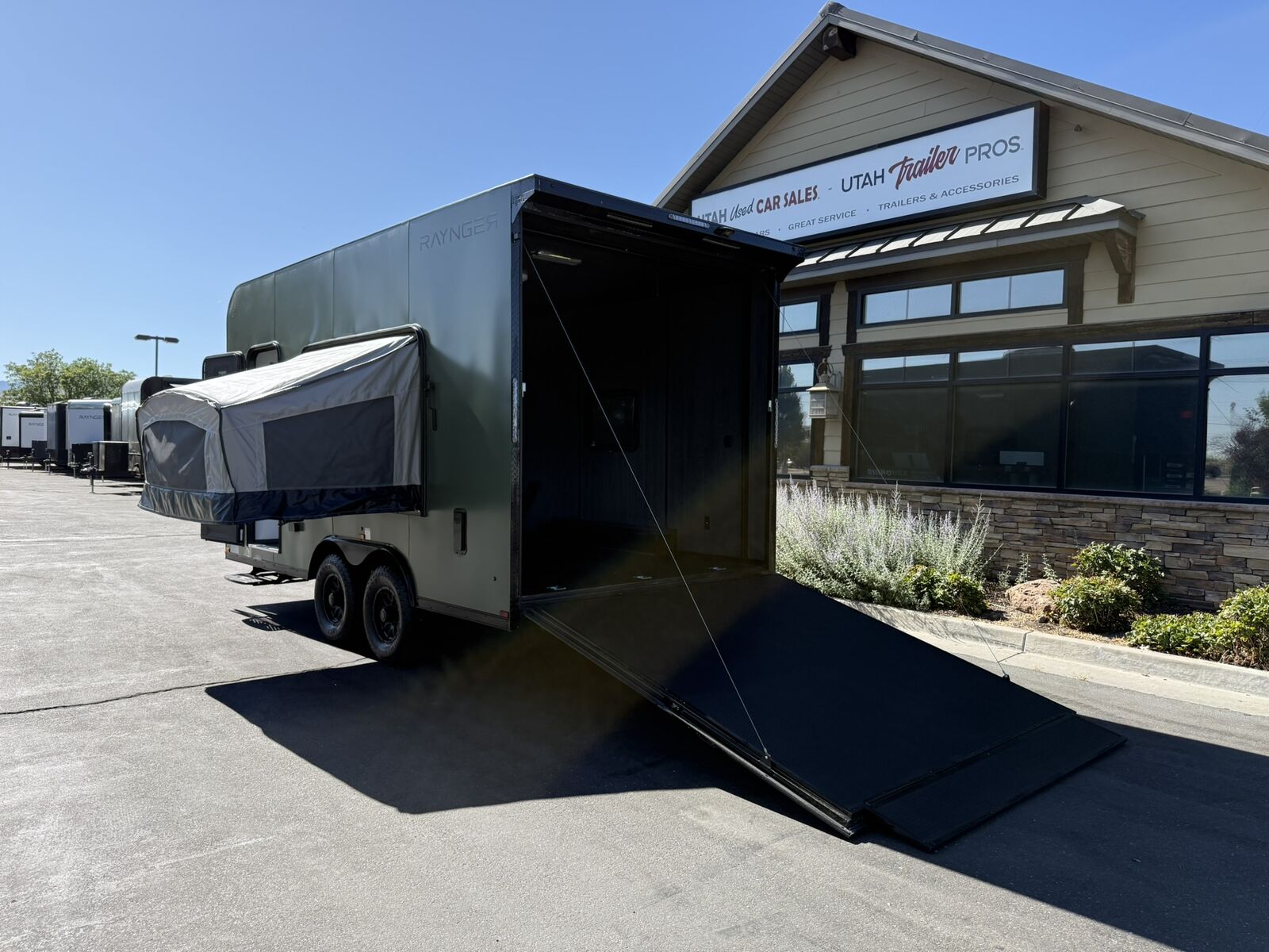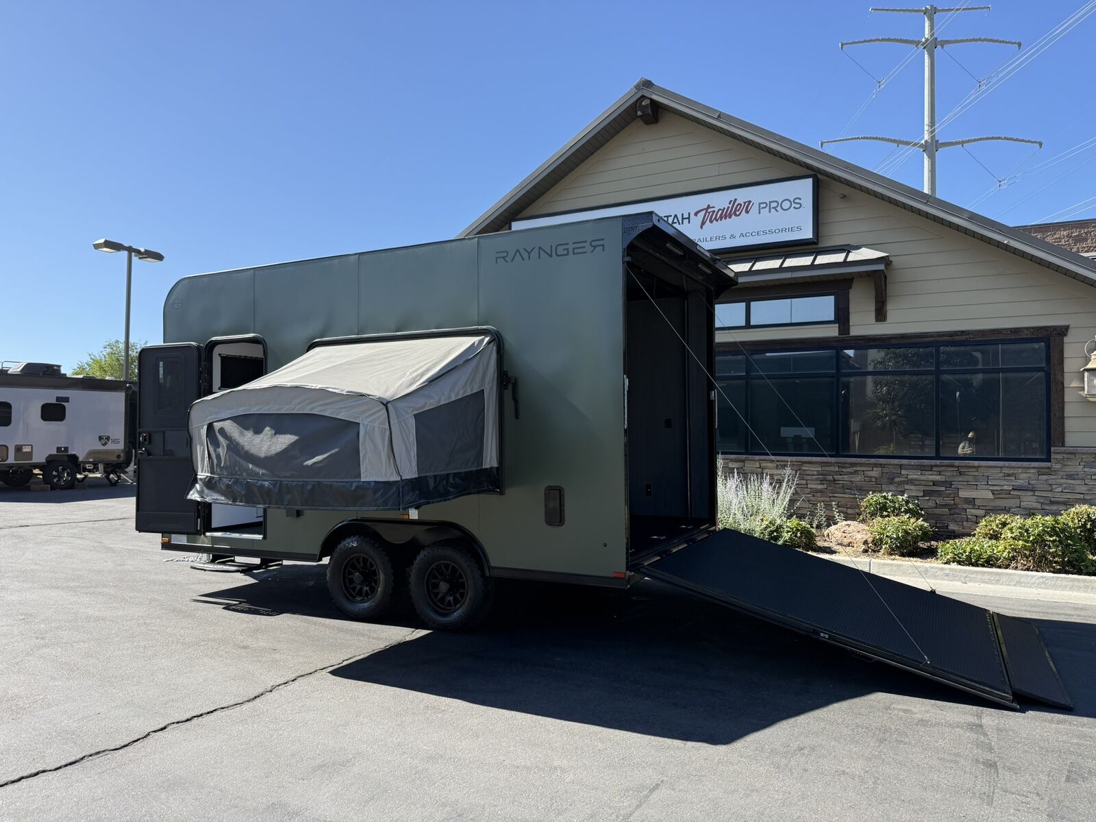 LIMITED TIME $259 A MONTH WITH ZERO DOWN WITH OUR SPECIAL LOCAL CREDIT UNION PARTNER!!! NO PRE-PAYMENT PENALTIES!!! NEW 8.5 WIDE MODEL!!! WILL FIT ANY STOCK SIDE BY SIDE UTV!!! RAYNGER PREMIUM OFF ROAD TOY HAULER CAMPER!!! 18 INCH GROUND CLEARANCE!!! OFF ROAD TIRES!!! FULLY INSULATED!!! HEATING AND A/C!!! WET SOUND STEREO!!! FOLD OUT/POP OUT TENT WITH MATTRESS!!! 87 Inch Rear Entry Height/90 INCH INTERIOR HEIGHT!!! 90 Inch Rear Entry Width!!! Ventilated Locking Generator Box!!! UPGRADED 5,200# TORSION AXLES!!! 14.2 Foot Long Garage Space!!! And Much MUCH MORE!!! Check out our Specs!!! Also available in 18 foot models. 18 Foot Models can have 3 Fold Out Beds/Pop Out Tents. 16 Foot and 18 Foot Models will fit ANY stock 4 Seater Side by Side • 6” I Beam Frame• Flat Top Design• Flat Front Design• Wall Posts 16” on Center• Cross Members 16” on Center• Roof Bows 16” on Center• Rust Inhibiting Z-Tech Protection on Chassis• Ameraguard on Tongue• Ameraguard on Rear Bumper• Ameraguard Around All Door Openings and Stepwell• Ameraguard Around Edges of Ramp Door• 3500 LB Spring Axles• 2-5/16” Coupler• One-Piece Aluminum Roof• ST235/75R15 Aluminum Wheels with Chrome Center Caps• 2000# Ramp Door with Eberhard Latch• 30” Tempered Glass RV Door with Screen Door• .030 Exterior Metal with Screwless Sides• 24” Black Stoneguard• 3” Black Bottom Trim• Sand Pad• Black Door Hold• 2.7mm Charcoal Textured Vinyl Ceiling • 9mm Charcoal Textured Vinyl Walls• 3/4” Engineered Wood Floor with Rubber Coin Overlay• (6) 1200 LB Floor D rings Installed with Backer Plates• LED Clearance Lights and Tail Lights• LED Back-up Lights• No Show Wheel Box• Spoiler with Toggle Switch• RV Step• 7’ Interior• (2) 17” Chrome Base Lights with Switch• (1) Black 17” Spot Light with Switch• (1) 30 Amp Panel with Marine Plug• A/C Unit with Heat Strip• (3) Interior Recepts• (1) Exterior Recept• 12V Battery and Charge Line• Prep for Backup Camera• Wet Sounds System• (3) Blue Interior Cabinet Lights• (1) 6’ Section of Flex Lights• Black ATP Rear Header and Hoop• Black ATP Fenders• Insulated Walls & Ceiling• Base Cabinets• Overhead Cabinets with Netting Over Compartments• Pop Out Tent• Black ATP Storage/Generator Box Mounted On Tongue Stock
