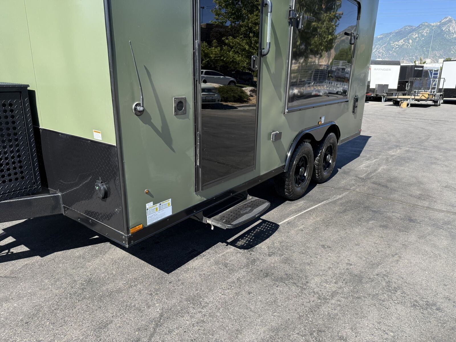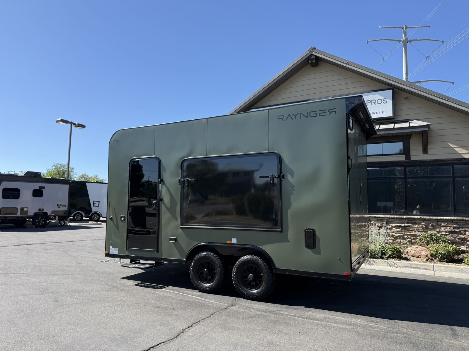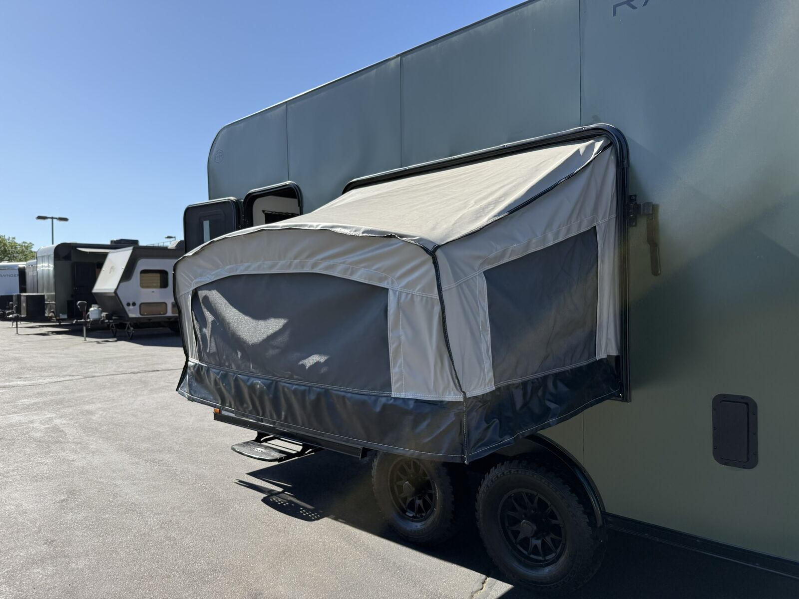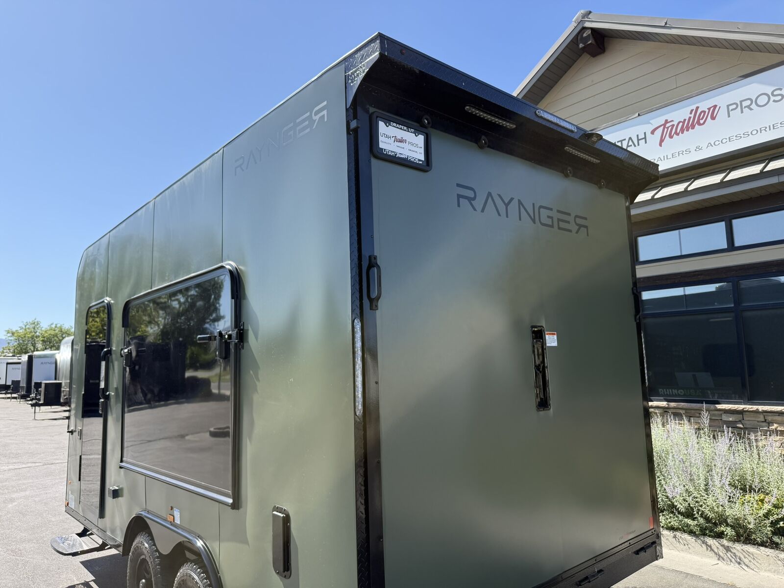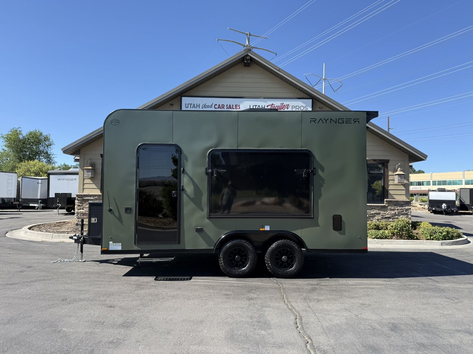 LIMITED TIME $259 A MONTH WITH ZERO DOWN WITH OUR SPECIAL LOCAL CREDIT UNION PARTNER!!! NO PRE-PAYMENT PENALTIES!!! NEW 8.5 WIDE MODEL!!! WILL FIT ANY STOCK SIDE BY SIDE UTV!!! RAYNGER PREMIUM OFF ROAD TOY HAULER CAMPER!!! 18 INCH GROUND CLEARANCE!!! OFF ROAD TIRES!!! FULLY INSULATED!!! HEATING AND A/C!!! WET SOUND STEREO!!! FOLD OUT/POP OUT TENT WITH MATTRESS!!! 87 Inch Rear Entry Height/90 INCH INTERIOR HEIGHT!!! 90 Inch Rear Entry Width!!! Ventilated Locking Generator Box!!! UPGRADED 5,200# TORSION AXLES!!! 14.2 Foot Long Garage Space!!! And Much MUCH MORE!!! Check out our Specs!!! Also available in 18 foot models. 18 Foot Models can have 3 Fold Out Beds/Pop Out Tents. 16 Foot and 18 Foot Models will fit ANY stock 4 Seater Side by Side • 6” I Beam Frame• Flat Top Design• Flat Front Design• Wall Posts 16” on Center• Cross Members 16” on Center• Roof Bows 16” on Center• Rust Inhibiting Z-Tech Protection on Chassis• Ameraguard on Tongue• Ameraguard on Rear Bumper• Ameraguard Around All Door Openings and Stepwell• Ameraguard Around Edges of Ramp Door• 3500 LB Spring Axles• 2-5/16” Coupler• One-Piece Aluminum Roof• ST235/75R15 Aluminum Wheels with Chrome Center Caps• 2000# Ramp Door with Eberhard Latch• 30” Tempered Glass RV Door with Screen Door• .030 Exterior Metal with Screwless Sides• 24” Black Stoneguard• 3” Black Bottom Trim• Sand Pad• Black Door Hold• 2.7mm Charcoal Textured Vinyl Ceiling • 9mm Charcoal Textured Vinyl Walls• 3/4” Engineered Wood Floor with Rubber Coin Overlay• (6) 1200 LB Floor D rings Installed with Backer Plates• LED Clearance Lights and Tail Lights• LED Back-up Lights• No Show Wheel Box• Spoiler with Toggle Switch• RV Step• 7’ Interior• (2) 17” Chrome Base Lights with Switch• (1) Black 17” Spot Light with Switch• (1) 30 Amp Panel with Marine Plug• A/C Unit with Heat Strip• (3) Interior Recepts• (1) Exterior Recept• 12V Battery and Charge Line• Prep for Backup Camera• Wet Sounds System• (3) Blue Interior Cabinet Lights• (1) 6’ Section of Flex Lights• Black ATP Rear Header and Hoop• Black ATP Fenders• Insulated Walls & Ceiling• Base Cabinets• Overhead Cabinets with Netting Over Compartments• Pop Out Tent• Black ATP Storage/Generator Box Mounted On Tongue Stock