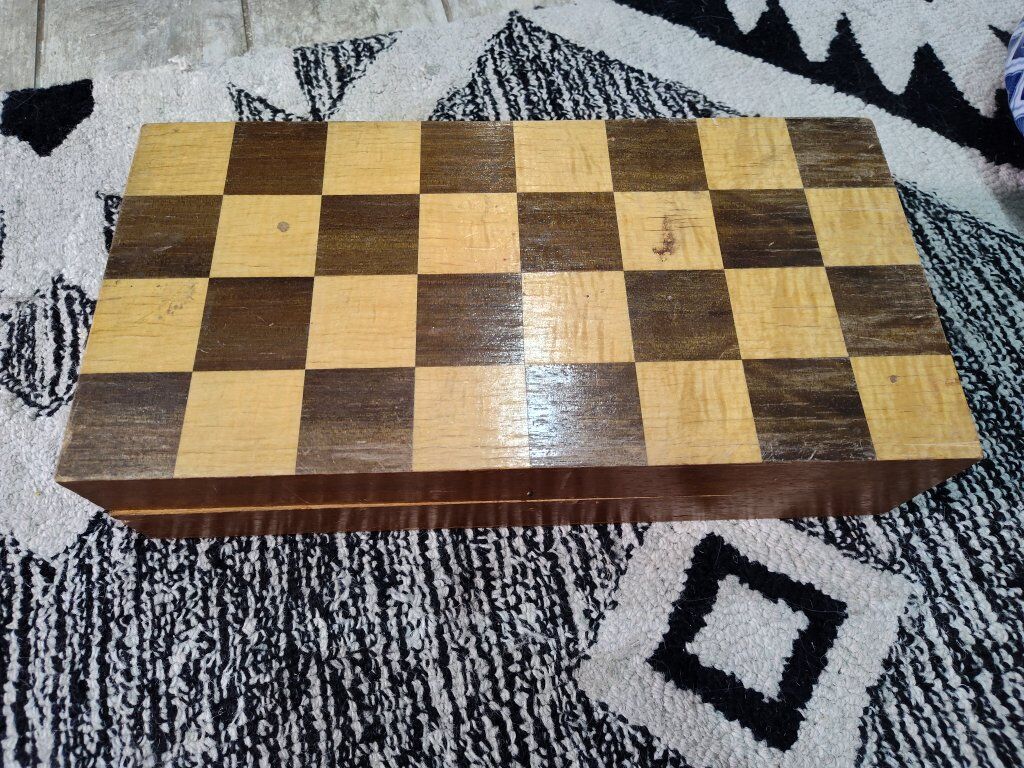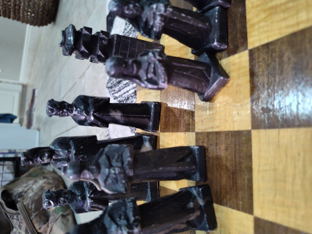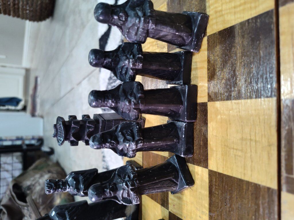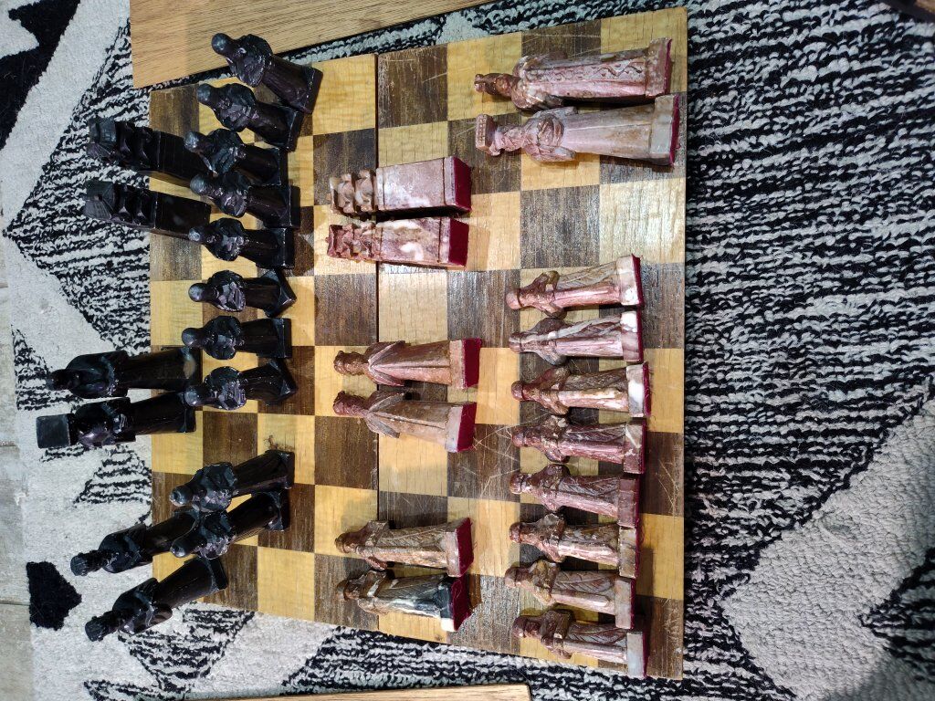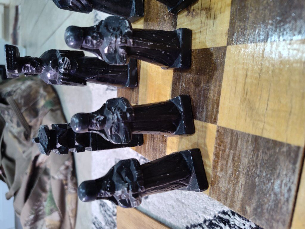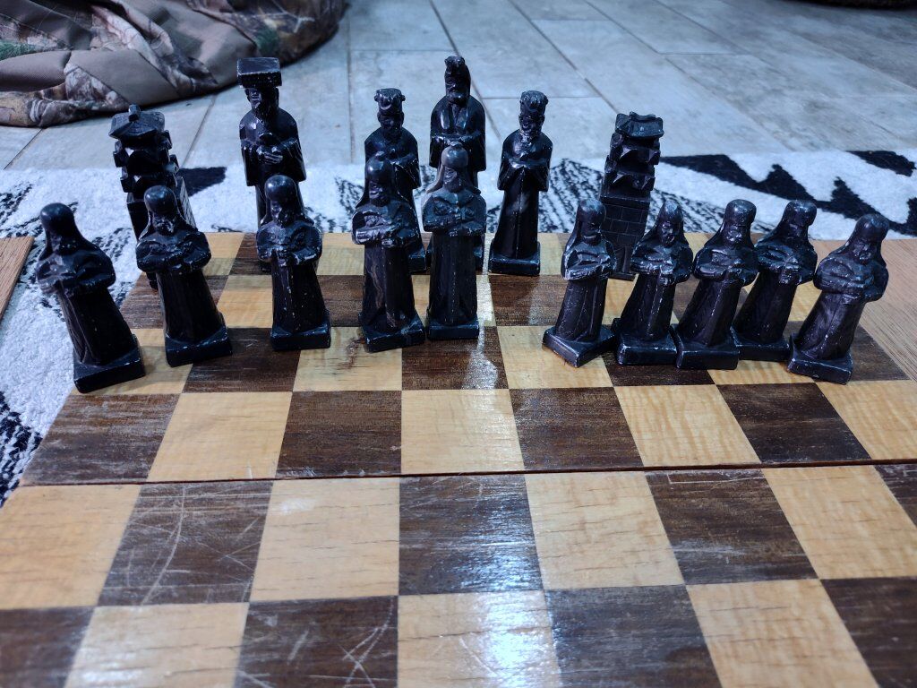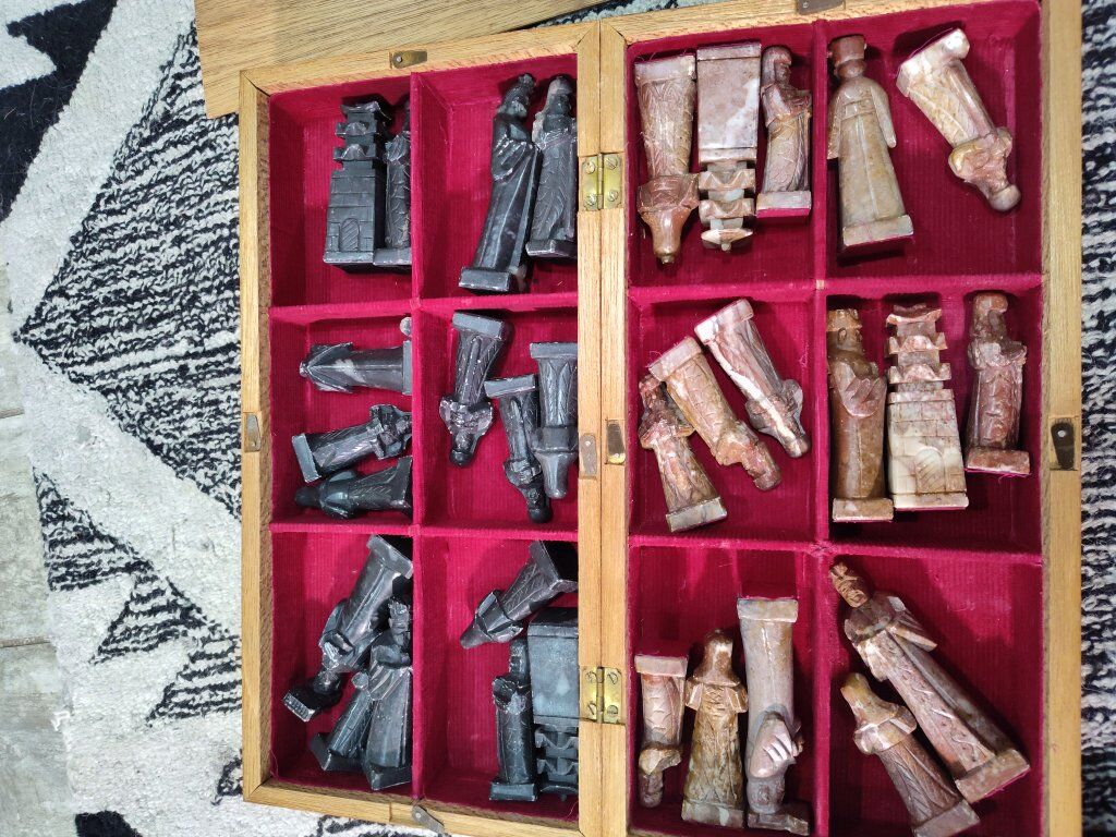 Vintage Asian inspired soapstone chess set. Hand carved pieces. The chess board does have quite a bit of scratching and wear and one piece needs a head glued back on. Other than that, it is a very unique piece for chess lovers!