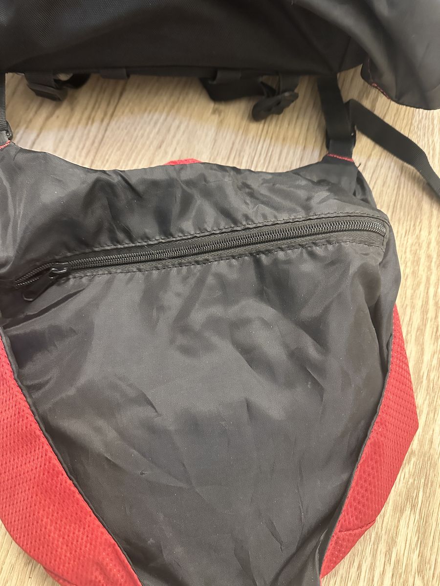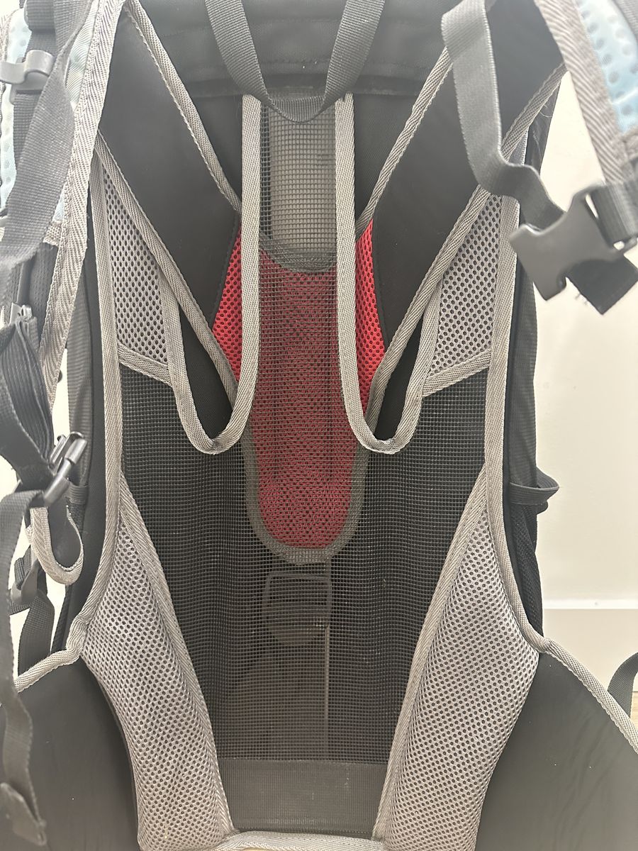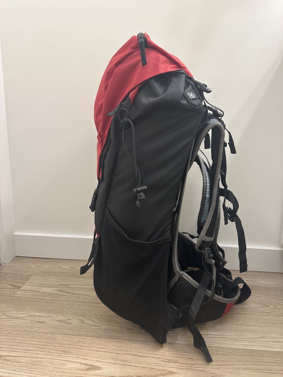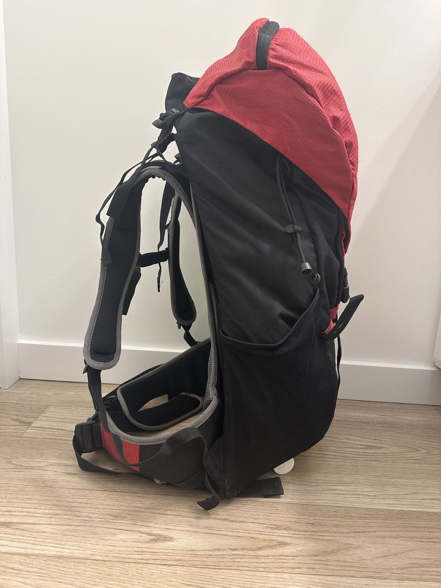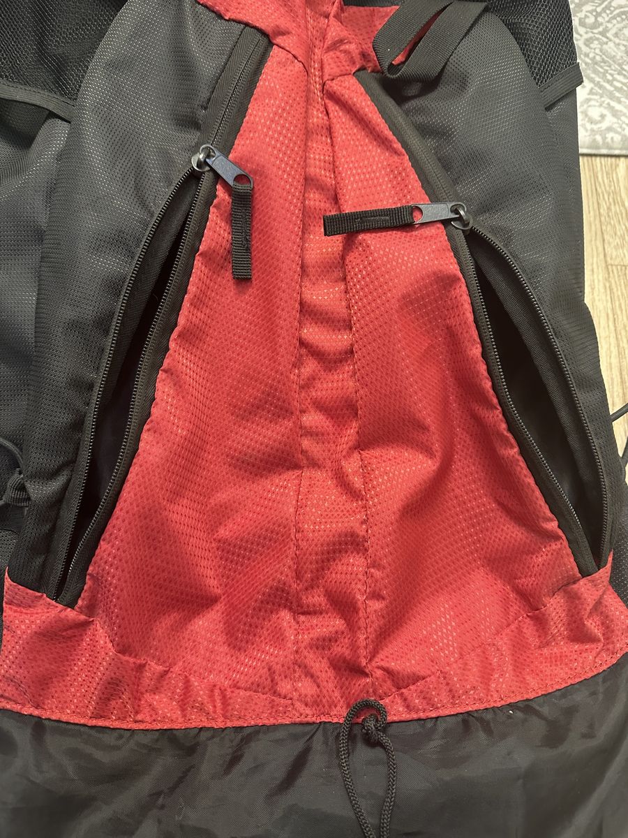 • It has a hydration bladder & offers ample space for gear. • Features a "Comfort Cool" rigid design intended to keep the pack's bulk off your back for better ventilation and comfort. • Includes a moisture-resistant drawstring closure for the main compartment and large mesh side pockets for water bottles or quick-access items. • Support: Equipped with an internal frame (metal support) and a center-pull hip belt to help transfer the load