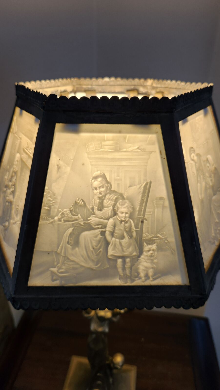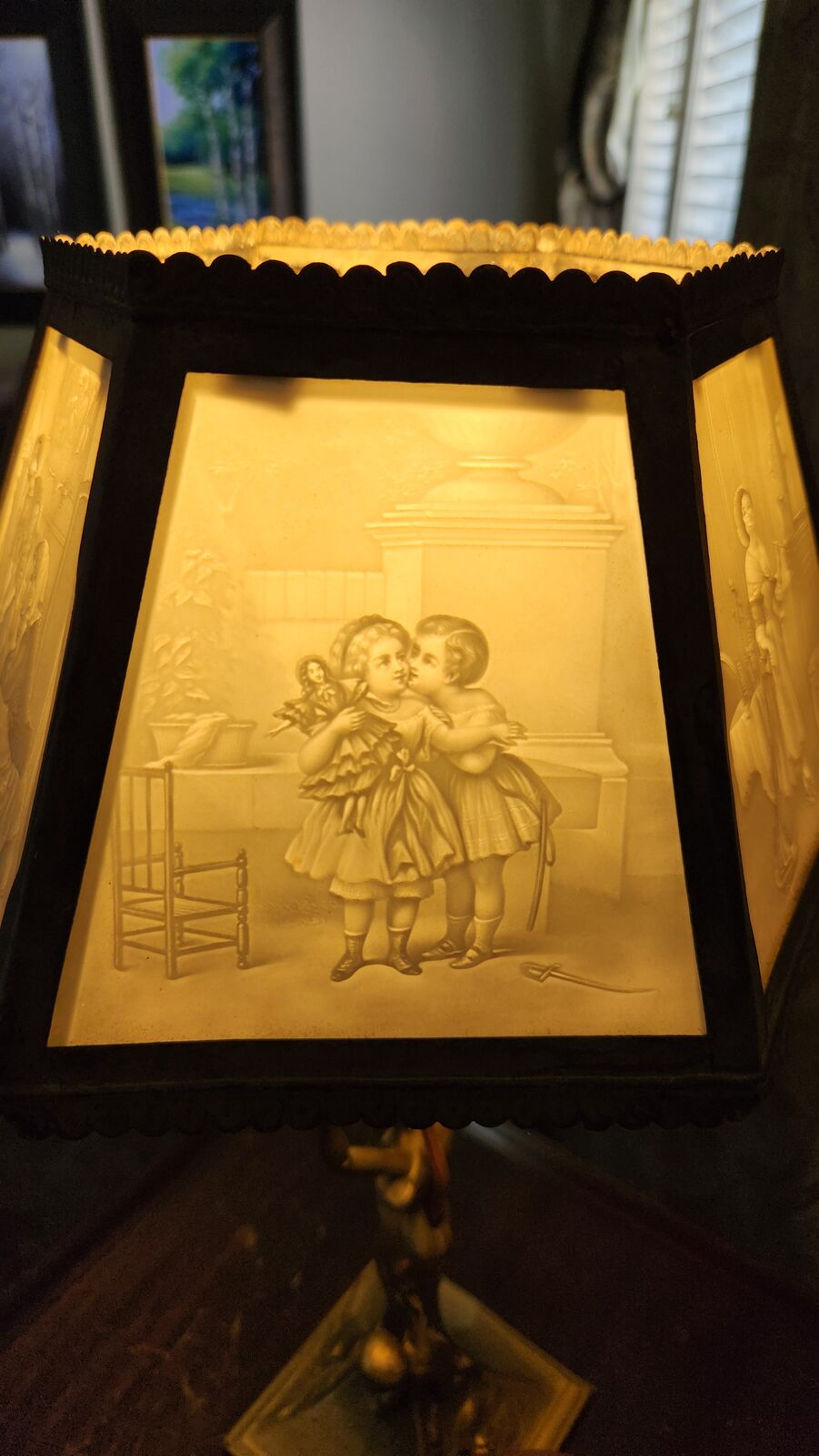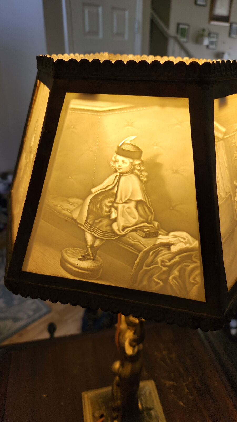 This beautiful antique lamp features a six-sided lithophane shade with intricate raised porcelain panels that come to life when illuminated. Each panel depicts a detailed domestic scene, showing remarkable artistry and craftsmanship that dates back to the 19th and early 20th centuries when lithophane lighting was most popular.
