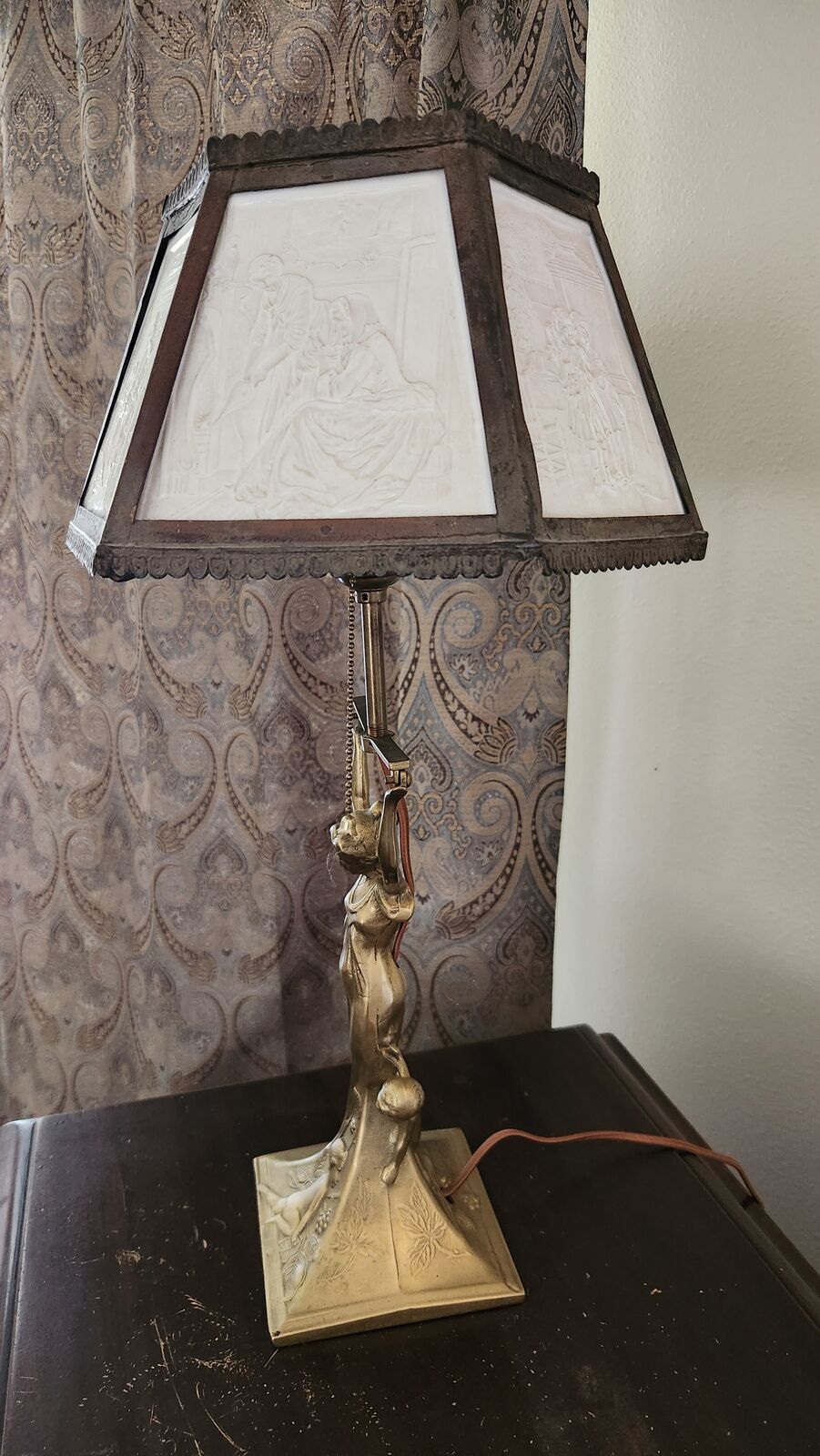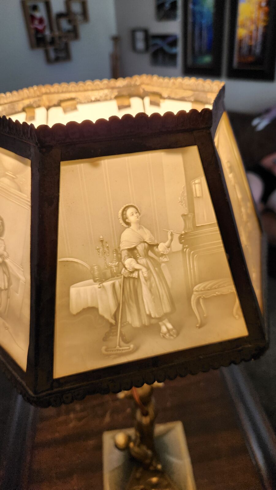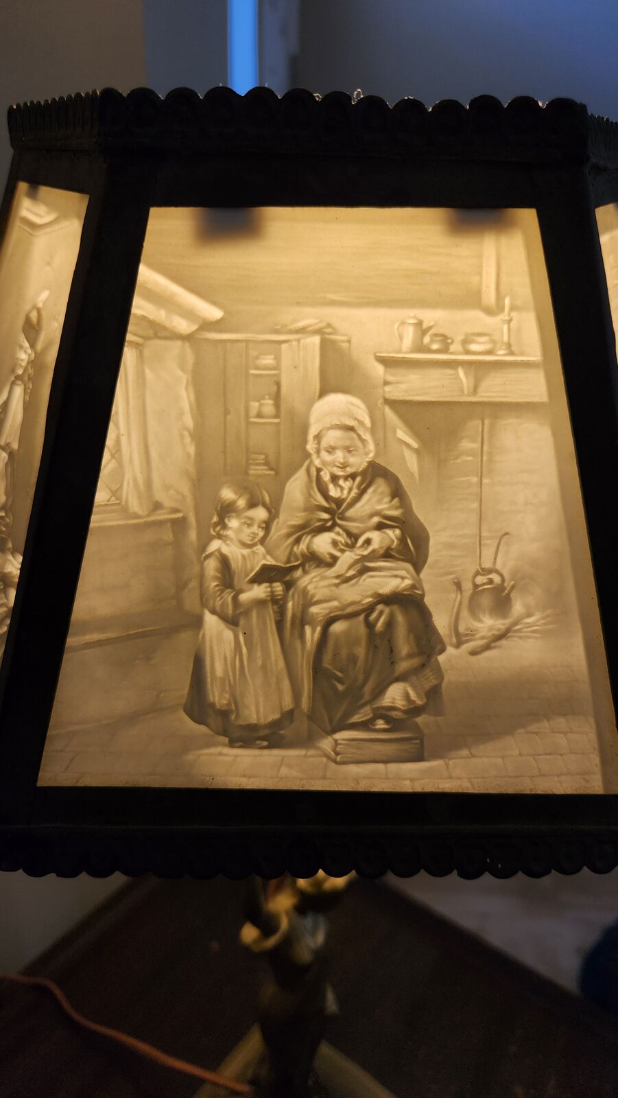 This beautiful antique lamp features a six-sided lithophane shade with intricate raised porcelain panels that come to life when illuminated. Each panel depicts a detailed domestic scene, showing remarkable artistry and craftsmanship that dates back to the 19th and early 20th centuries when lithophane lighting was most popular.
