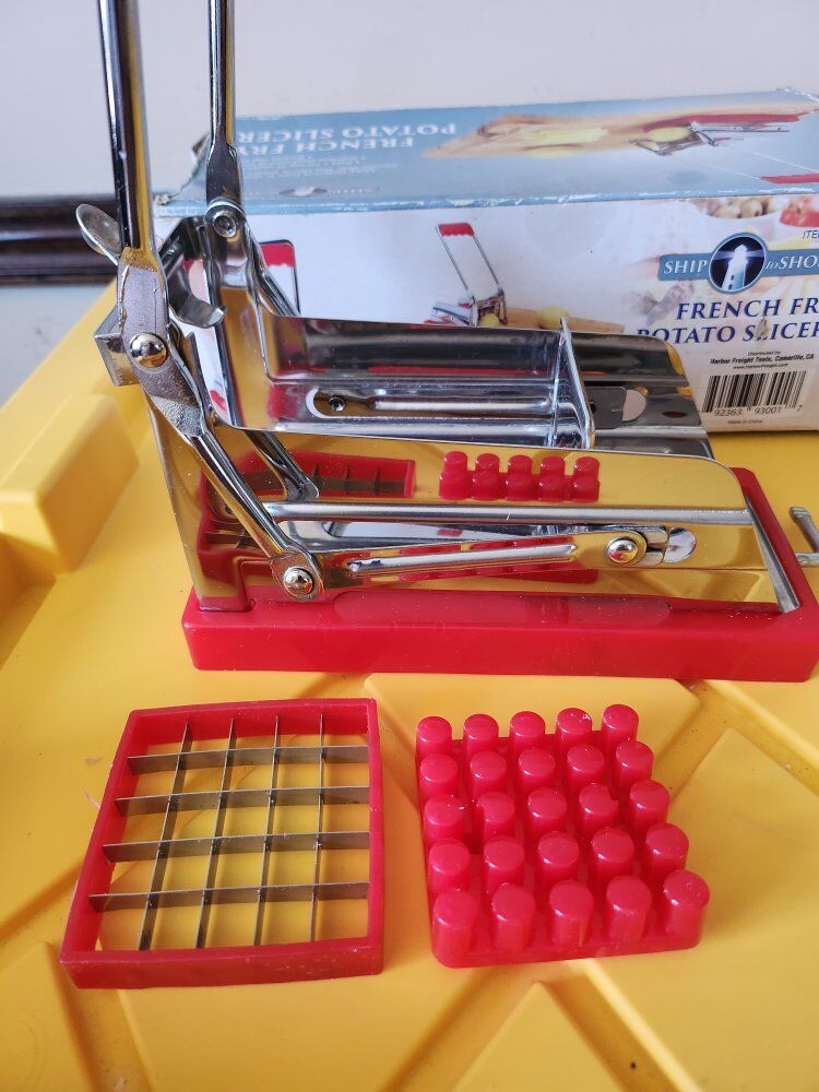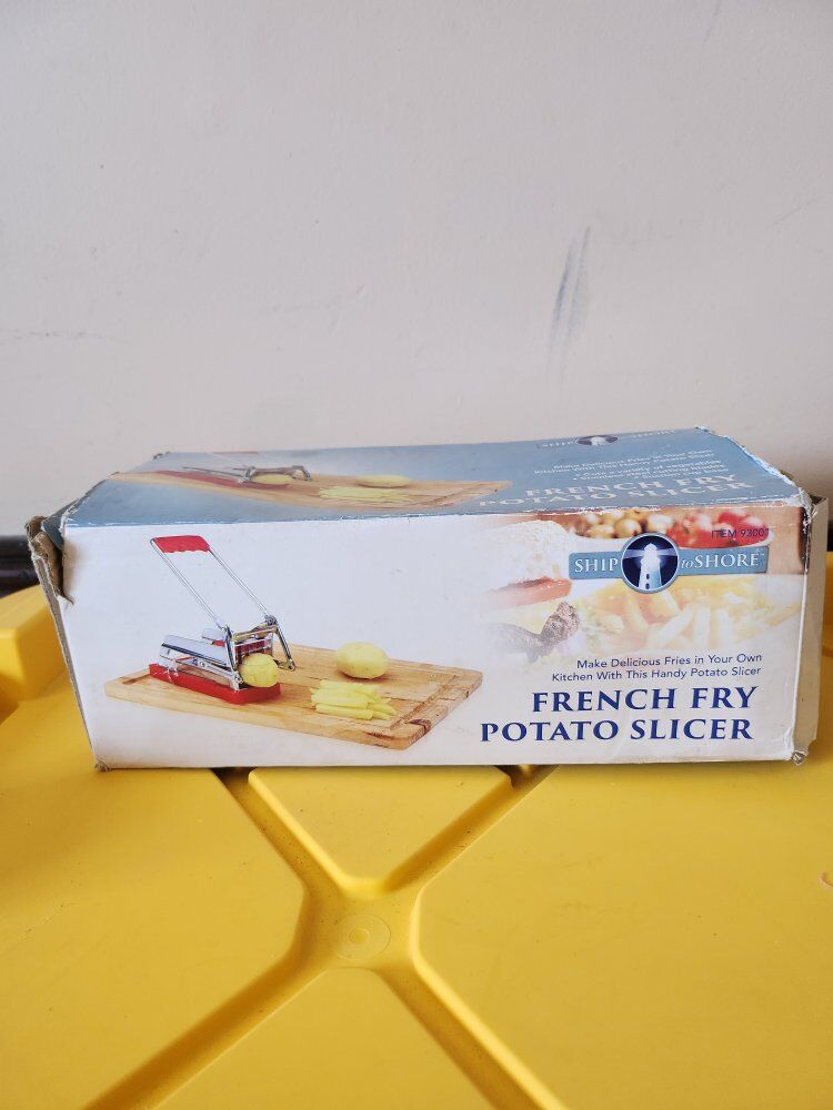In great condition, made of durable plastic and Stainless steel cutting blades. Suction cup baseCuts a variety of vegetables. Box in bad condition, but, Potato / Vegetables Slicer in excellent condition.