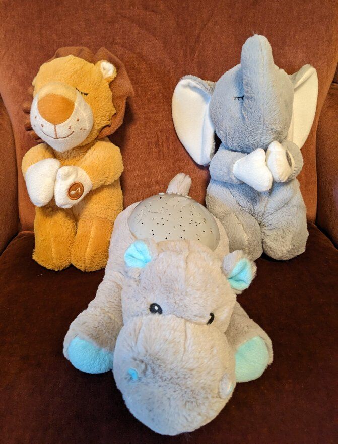 We also have some animals that say a little bedtime message when you press their hands. And the hippo shines stars on the ceiling for a nightlight.