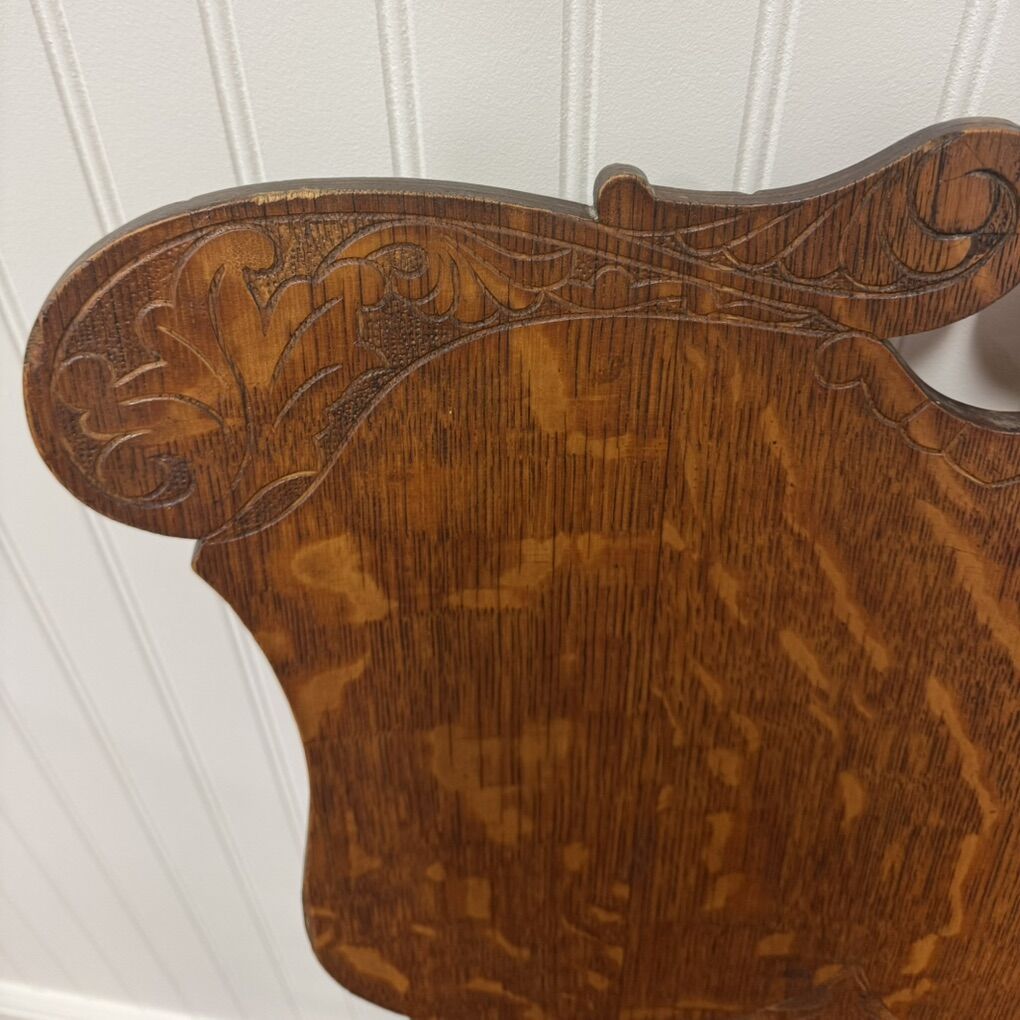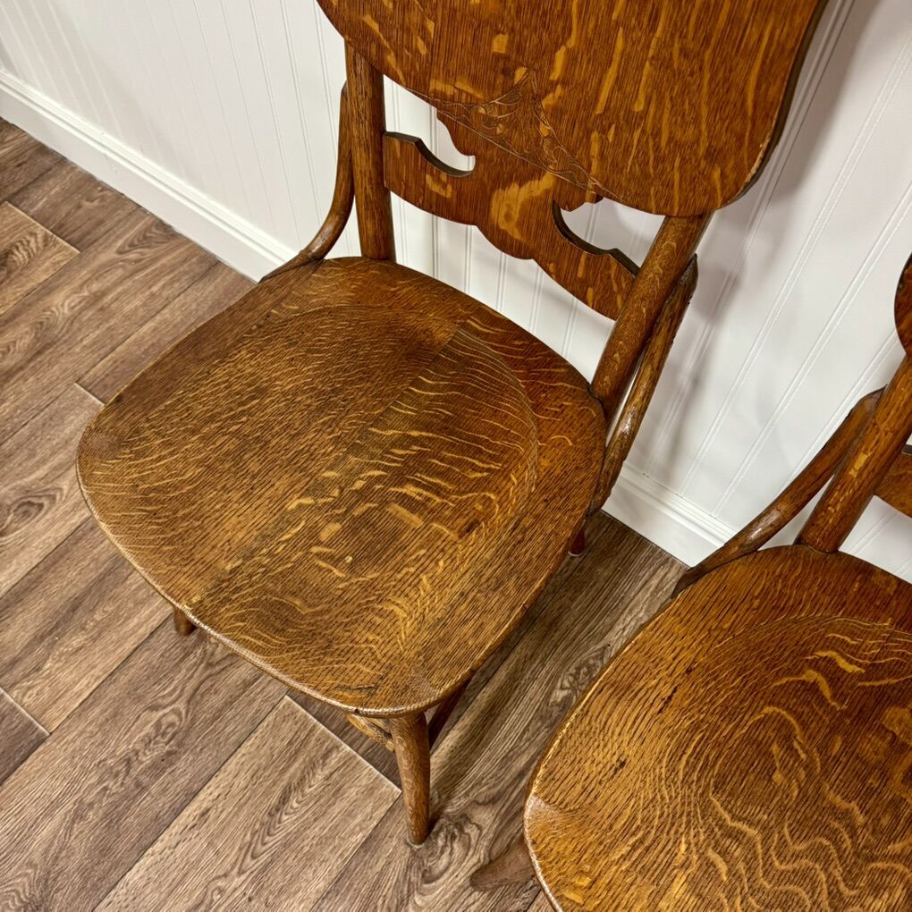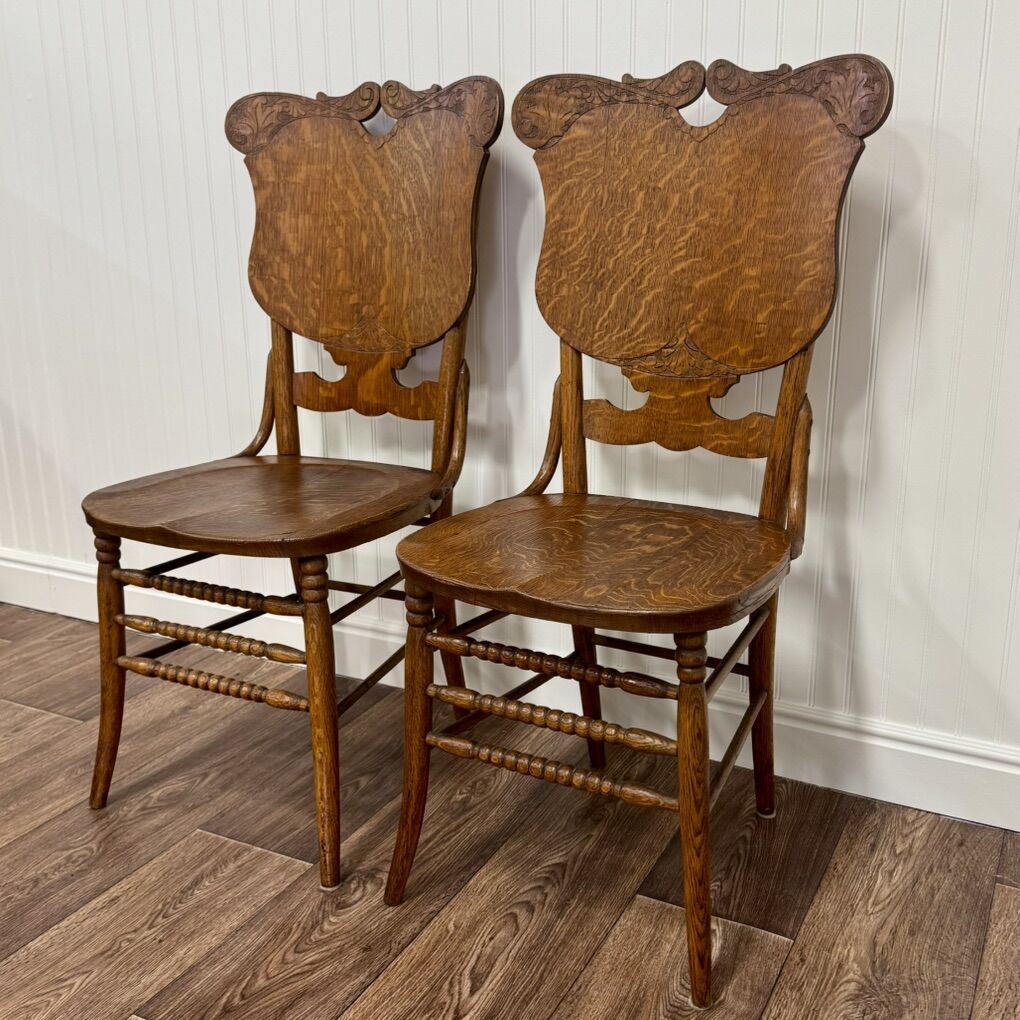 Beautiful pair of quarter-sawn tiger oak chairs with striking grain and ornate carved shield backs. These date from the late 1800s–early 1900s and feature turned spindle stretchers, contoured seats, and excellent craftsmanship. Sturdy and ready for use as accent chairs, entry seating, or at a small dining table. There are a couple chips in the veneer that are not very noticeable. See pictures for details. Sold as a pair.