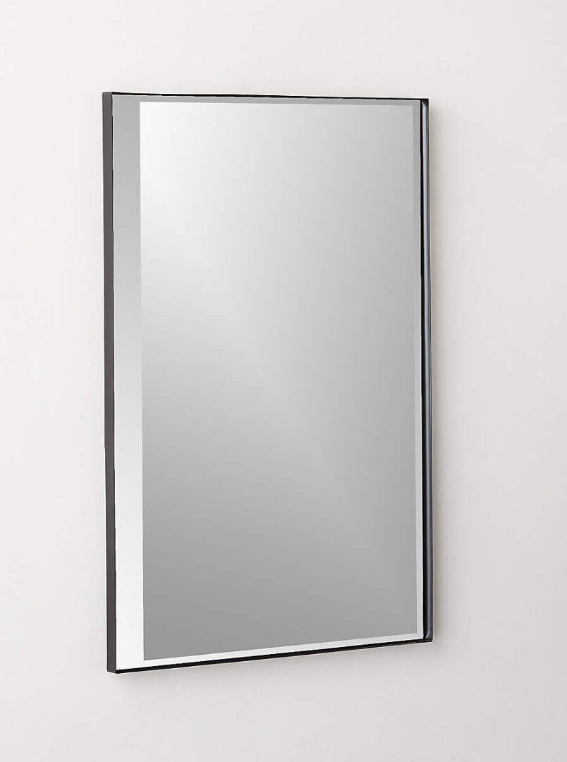 Graduate Beveled Black Rectangular Mirror 24"x36" Beveled edges and brass line up in a handcrafted rectangular mirror that boasts both simplicity and depth. Solid brass is finished in matte black for an elevated look that hangs stunning above a vanity or as a goes-anywhere decor piece. Part of the Graduate mirror collection. CB2 exclusive.