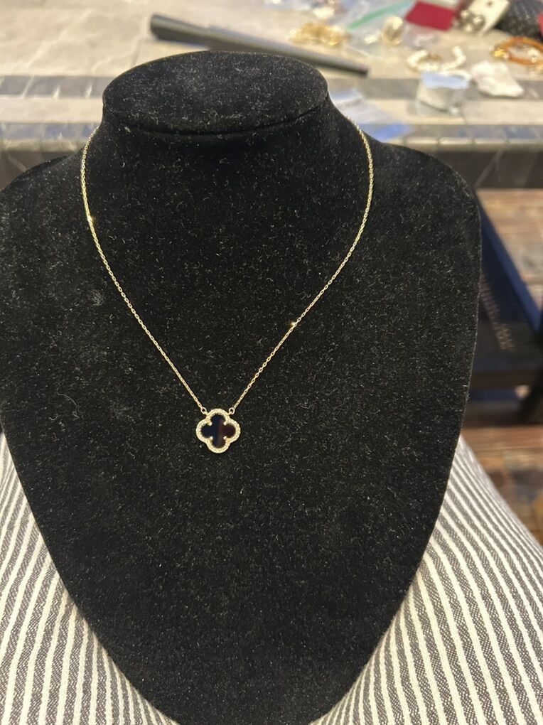 VenmoLike new Sterling silver van cleef clover black reversible necklace in gold tone with cubic zirconium stones. Clean smoke free home. Cash or Venmo. Pick up in Alpine.