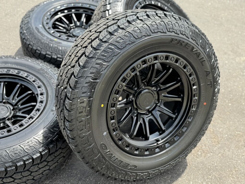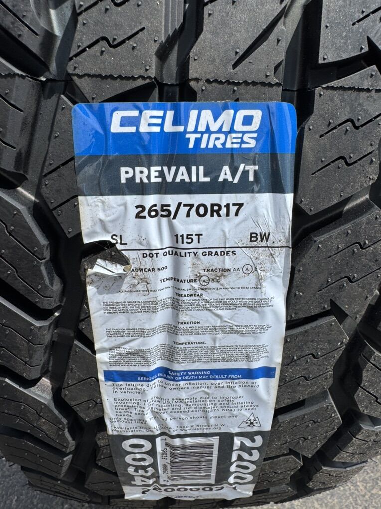Brand new wheels and tires. Stickers still on everything, never mounted to a truck. Tires are Celimo Prevail A/T 265/70R17 which is roughly 32x10.50x17 standard load rating.