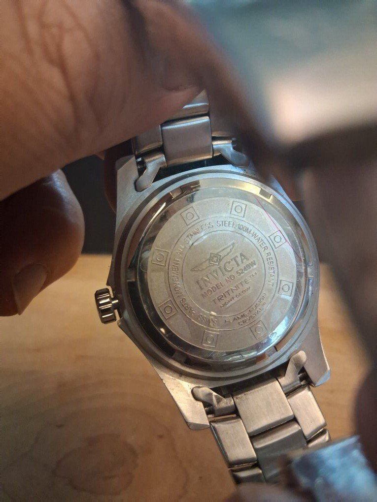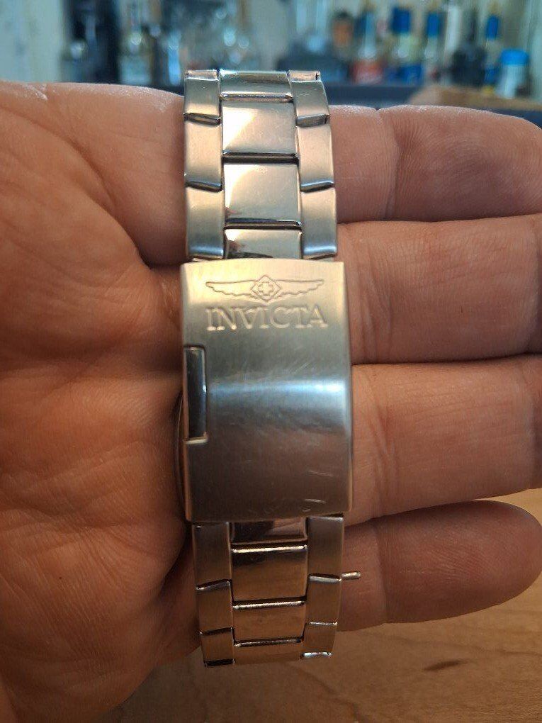 This watch is an Invicta Pro Diver in stainless steel with a white dial, model 5249. This is a popular and classic model within Invicta's Pro Diver collection. It's used with some wear and small scratches on it, but overall all in good working condition. Its water proof up to 100 meters and tells the date and day with the analog clock. It just needs a new battery.
