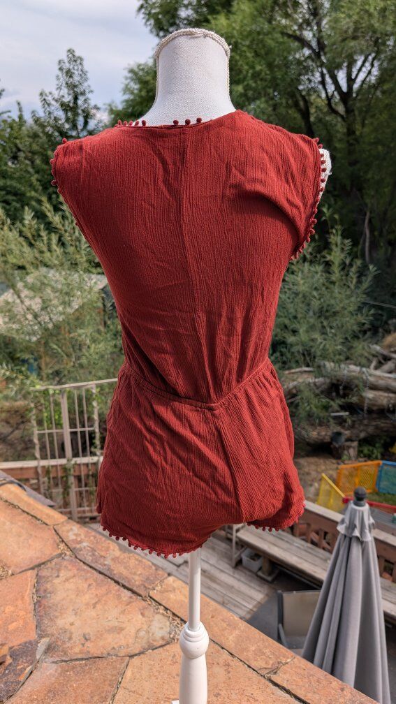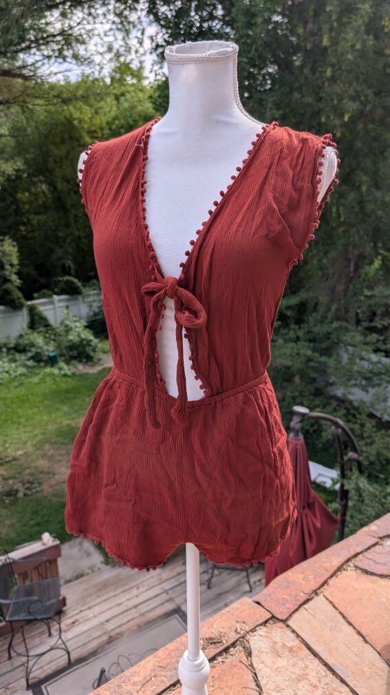 The maroon jumper is in pretty good condition, it has been worn and washed, it would look really cute over a swimsuit or sports bra.