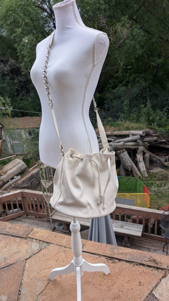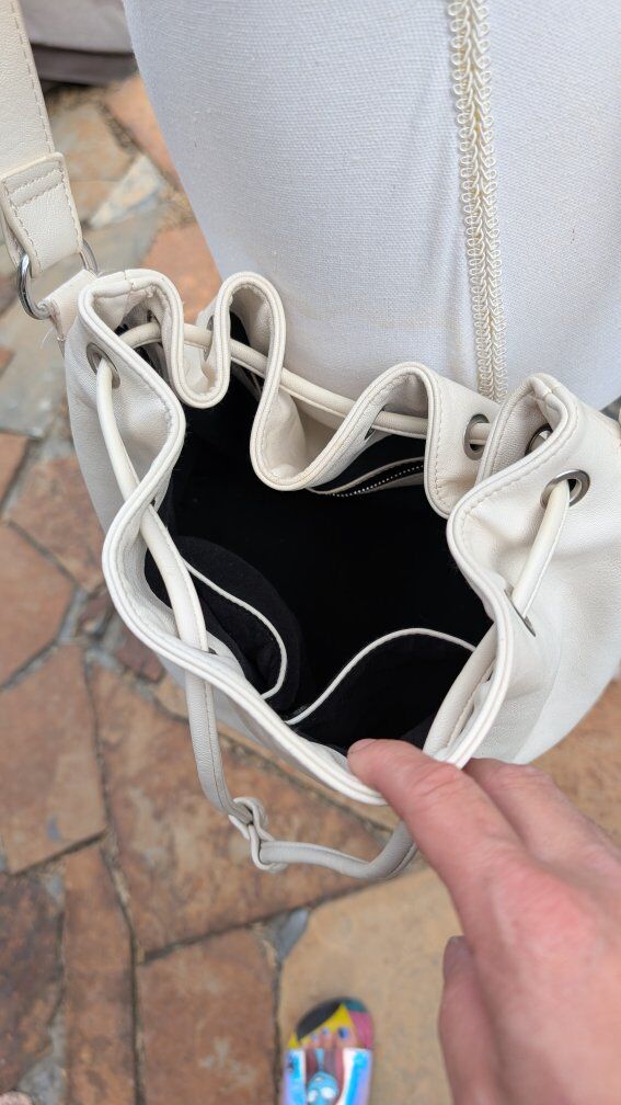 This bundle includes a white bucket purse, that is actually in pretty good condition. There is one spot on the bottom of it, and a couple small spots and scuffs here and there, but overall it's actually in great shape.