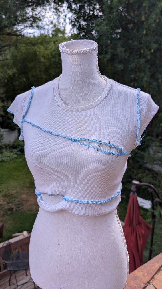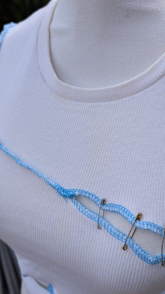 The white shirt with the safety pins in it would be a really fun over shirt for a Halloween costume, it does have some yellow staining around the neck and in the front.