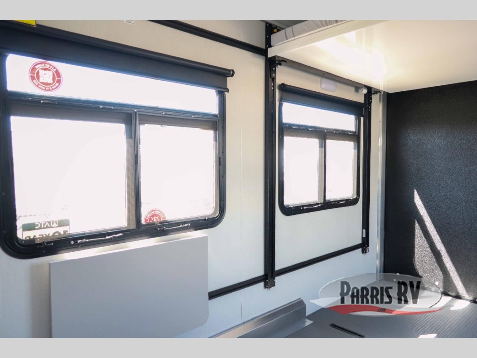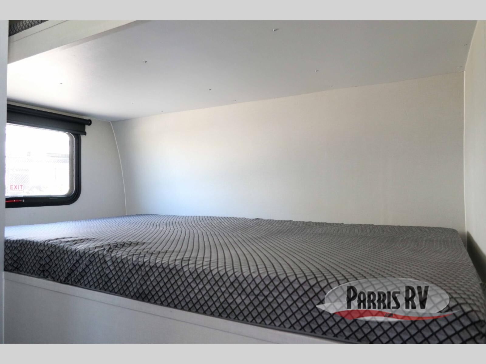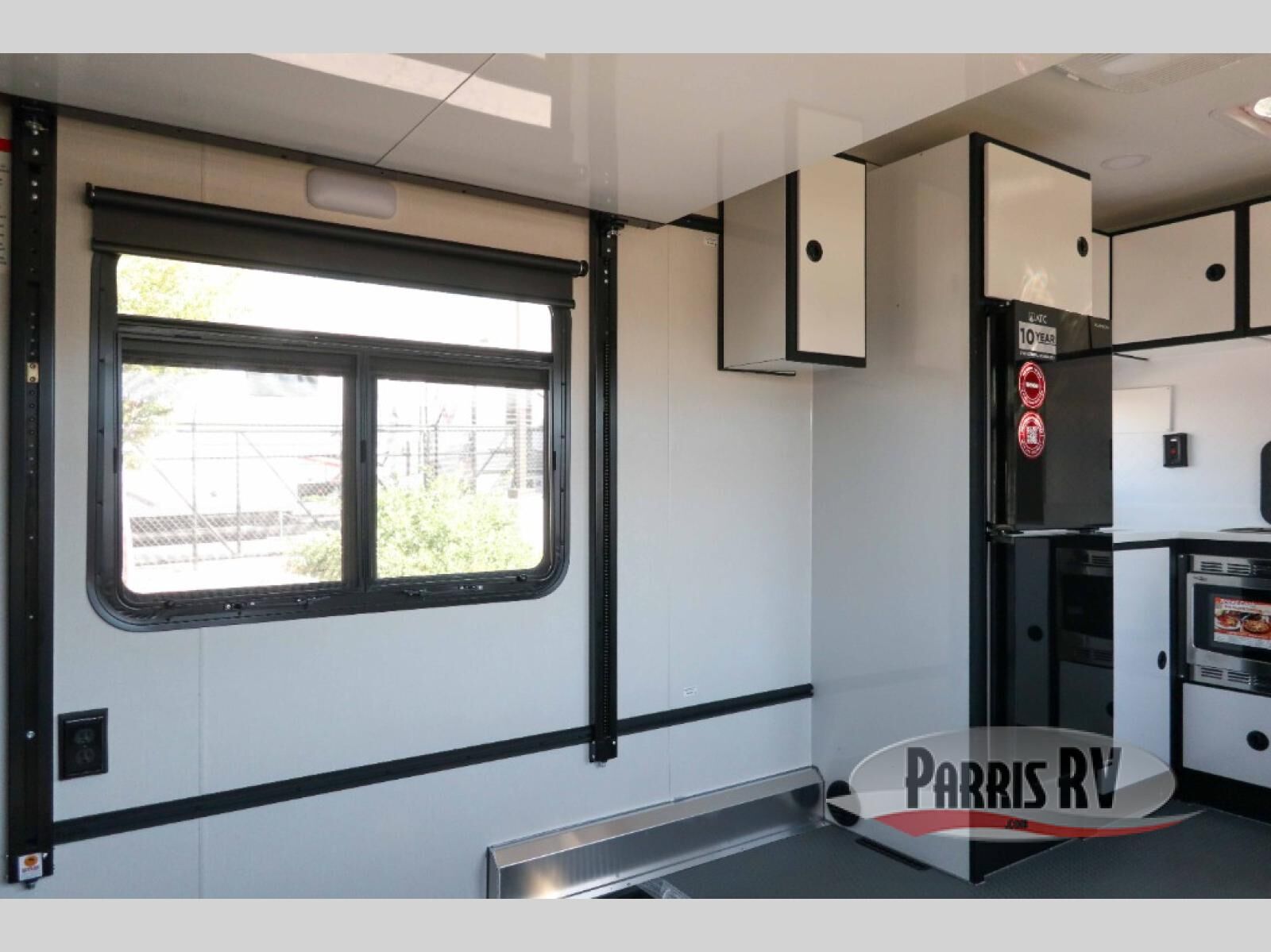 Grab your riding helmet and load up your bikes in this toy hauler! Once your toys are unloaded from the cable-less ramp door with non-slip tread, you can add an optional sleeper sofa to relax, then make lunch in the kitchen. There is a flush mount two burner LP cooktop and a convection microwave, plus a 12V refrigerator to store leftovers. The wet bath includes a shower and porcelain toilet so you can freshen up after a trail ride, and the front bunk beds will provide a great night's rest. And an optional Happijac queen bed can be added in the garage for even more sleeping space if needed!