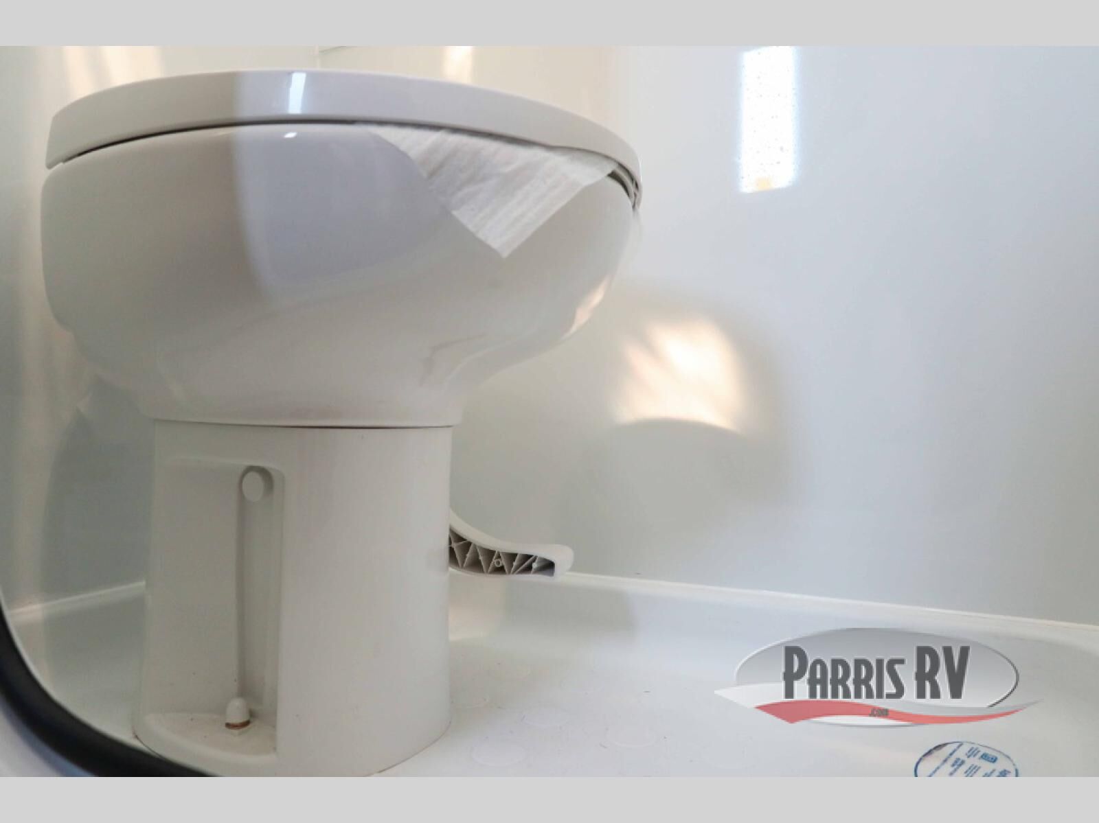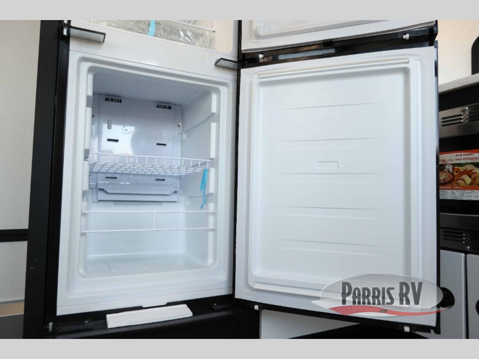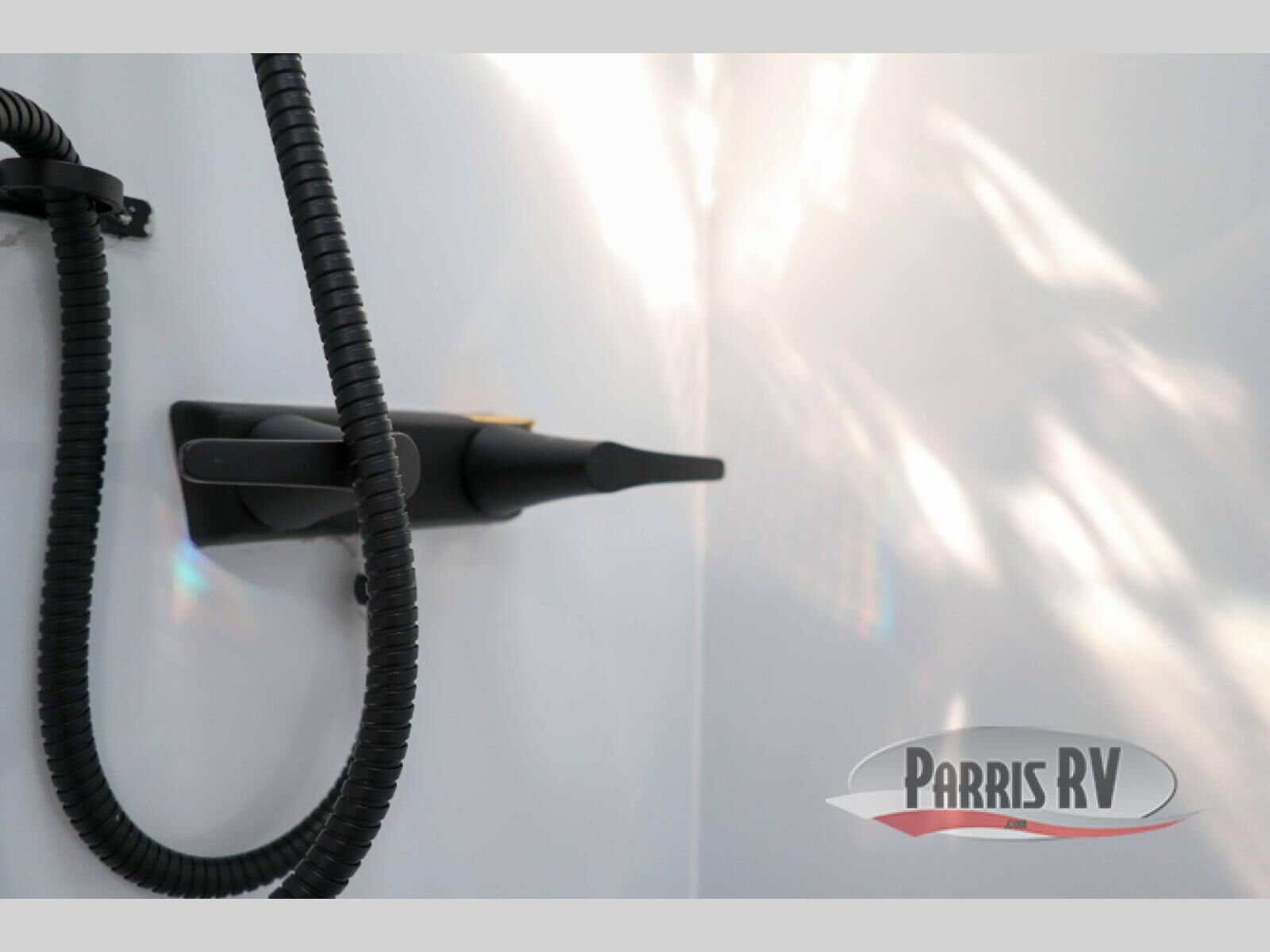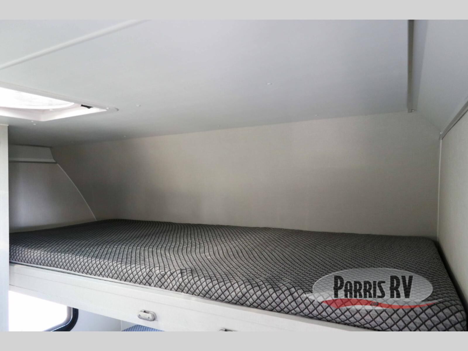 Grab your riding helmet and load up your bikes in this toy hauler! Once your toys are unloaded from the cable-less ramp door with non-slip tread, you can add an optional sleeper sofa to relax, then make lunch in the kitchen. There is a flush mount two burner LP cooktop and a convection microwave, plus a 12V refrigerator to store leftovers. The wet bath includes a shower and porcelain toilet so you can freshen up after a trail ride, and the front bunk beds will provide a great night's rest. And an optional Happijac queen bed can be added in the garage for even more sleeping space if needed!