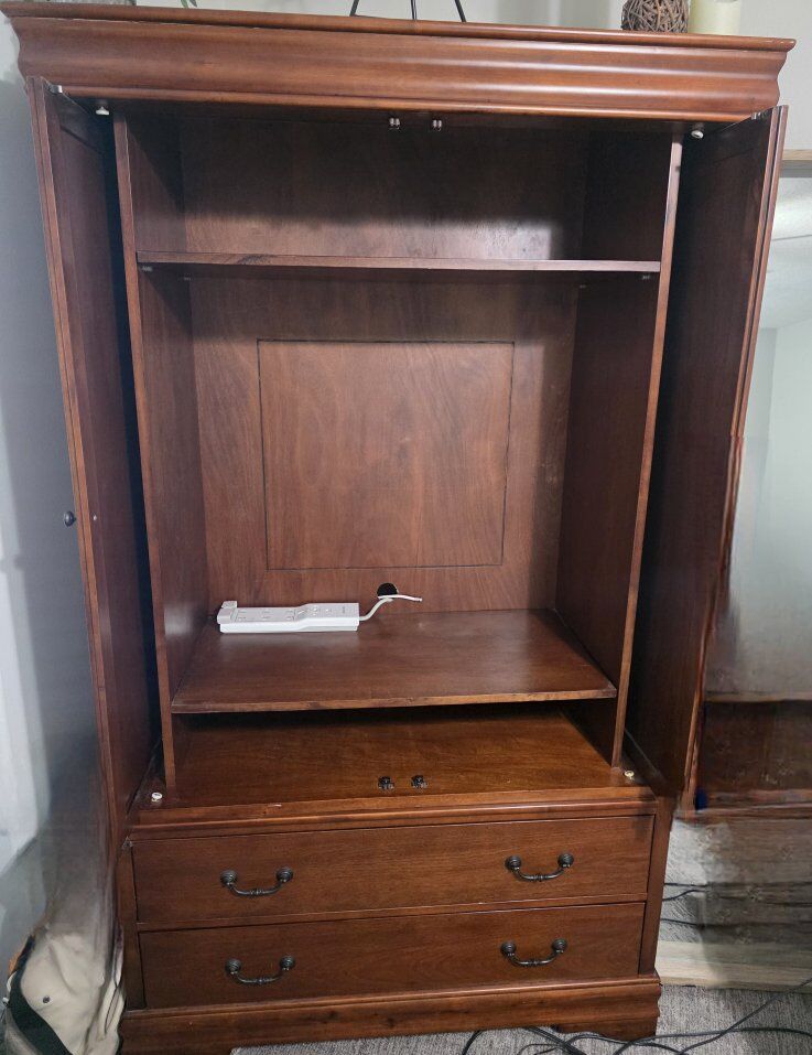 VenmoThis listing is for a solid wood Armoire. This could be for clothes or a TV. It has shelves that are removable and a closet rod could be added for clothes if wanted. Call or Text Mike 8017962711. Asking or Best Offer Once it is sold it will be removed.