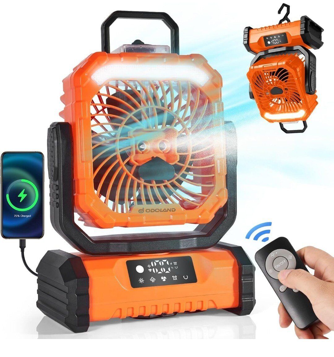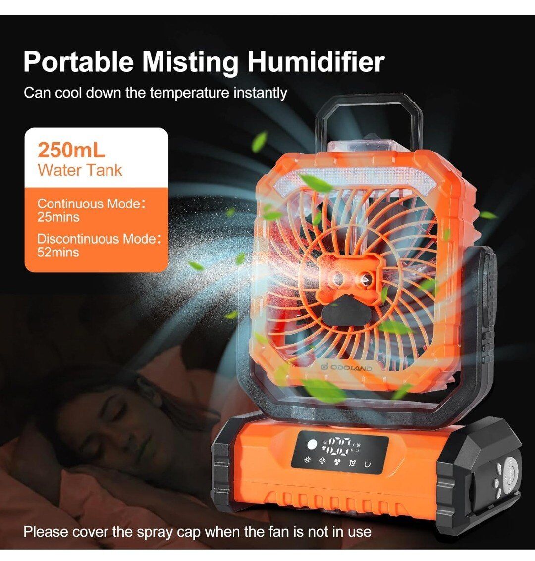 Odoland Portable Misting Fan with Light, 30000mAh Rechargeable Battery Camping Fan with 2 Spray Mister, Outdoors Tent Ventilador with Remote and Hook for Indoor Cooling Hiking Patio, Orange