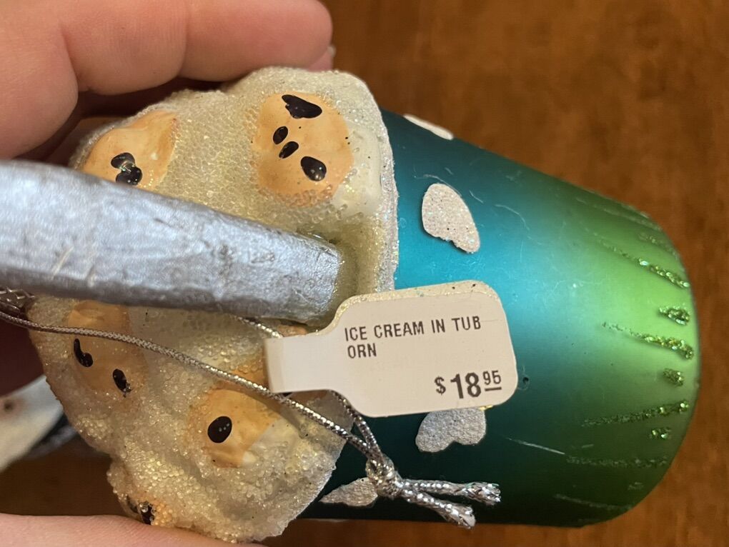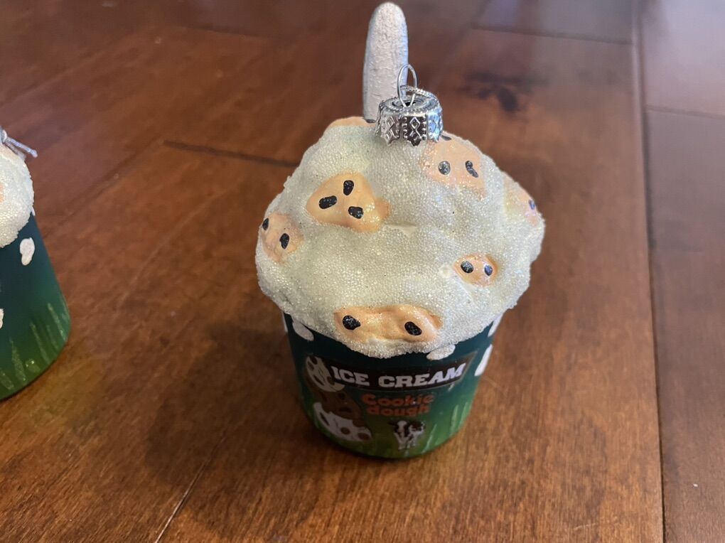 I have 3 new vintage style glass ornaments. They are Ben & Jerry’s Cookie Dough Ice Cream. They are 4 1/4 inches tall. The price tags show they were originally $18.95 each. I’m asking $8 for all of them together. See my other ads for jewelry, artwork, home decor and more.