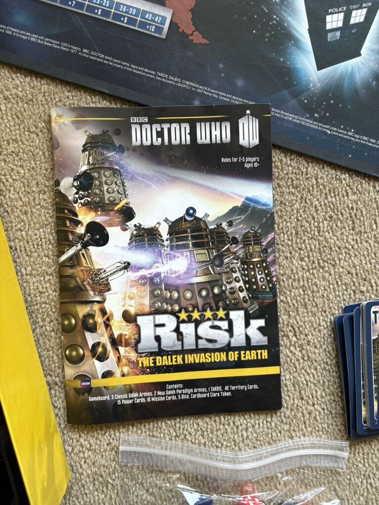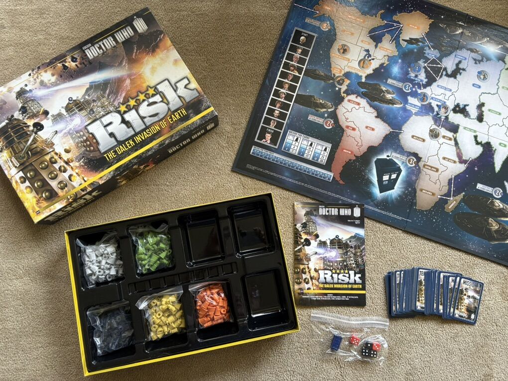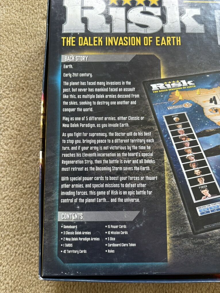 COMPLETE RISK: The Dalek Invasion of Earth. BBC Doctor Who edition of the classic board game. USAOPOLY, Hasbro, 2014. Ages 10+, 2-5 players. Complete, no missing pieces. Very good condition. Text only. Cash or Venmo.
