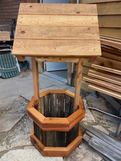 4 FT CEDAR WELL, AFRAME RUSTIC 2X4, ROOF CEDAR DRUM SLATS 30 YEAR OLD CEDAR FENCING DRUM REDWOOD. DECK SCREWS AND LINSEED OIL HAS LOG AND J HOOK FOR PLANTER