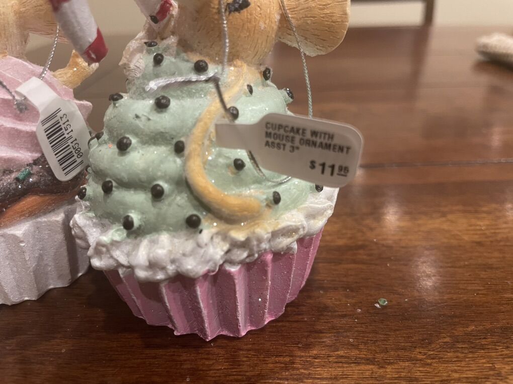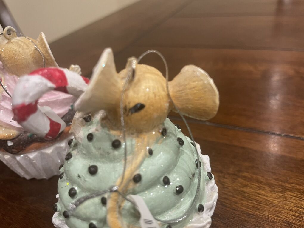 I have 2 new ornaments with mice on cupcakes. They are 3 1/2 inches tall. The price tags show they were originally $11.95 each. I’m asking $8 for both of them together. One of them has a mark on the back of his head and a small mark on one cheek (see the last 2 pictures). See my other ads for jewelry, artwork, home decor and more.