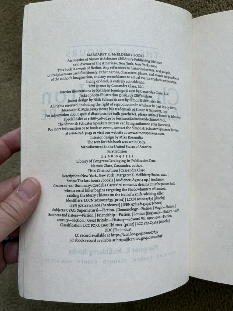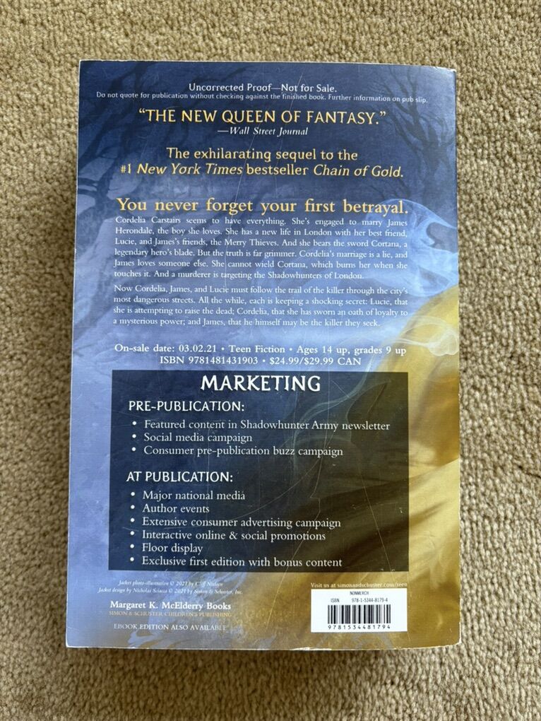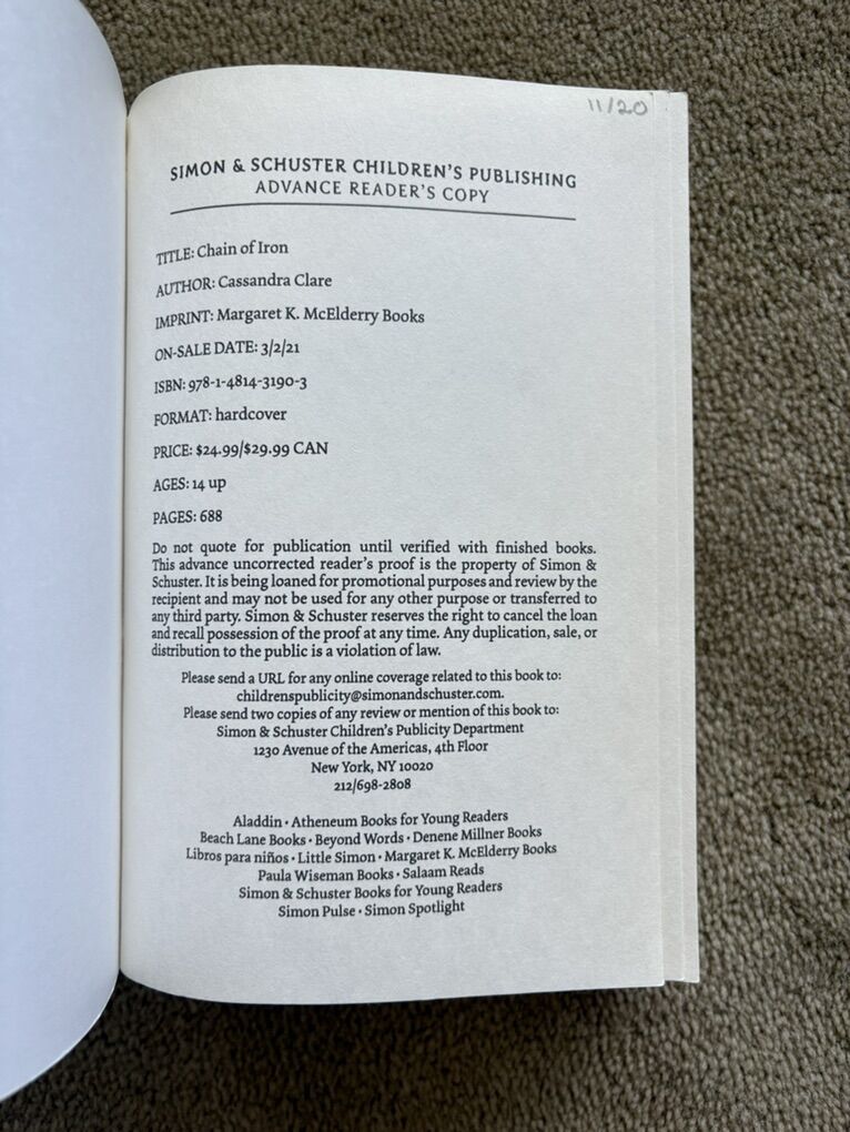 Chain of Iron, by Cassandra Clare (RARE ARC Advance Reader's Copy): The Last Hours, Book Two. A Shadowhunters Novel. McElderry Books, March 2021, 656 pages. Oversized paperback in very good condition. Front edge of spine slightly worn. Text only. Cash or Venmo.