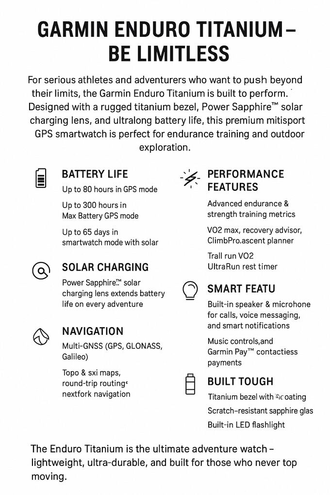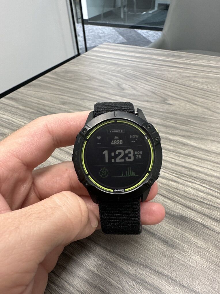 ZelleGarmin Enduro Titanium GPS Watch $899 retail– Ultralight titanium multisport watch built for endurance athletes. Incredible battery life (up to 80 hrs GPS / 65 days smartwatch mode), solar charging, rugged titanium bezel, power glass, and advanced training metrics. Perfect for running, hiking, and outdoor adventures. Excellent condition.