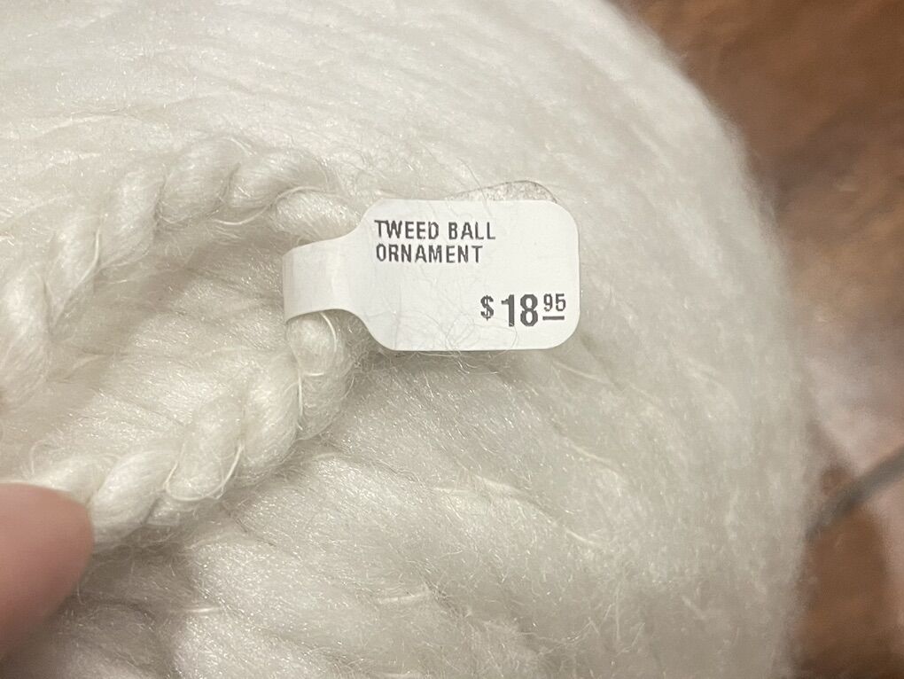 I have a new large ball ornament covered in white yarn. It is about 6 inches across and has a white rope hanging loop that adds another 5 1/2 inches. The price tag shows it was originally $18.95. I’m asking $4. See my other ads for jewelry, artwork, home decor and more.