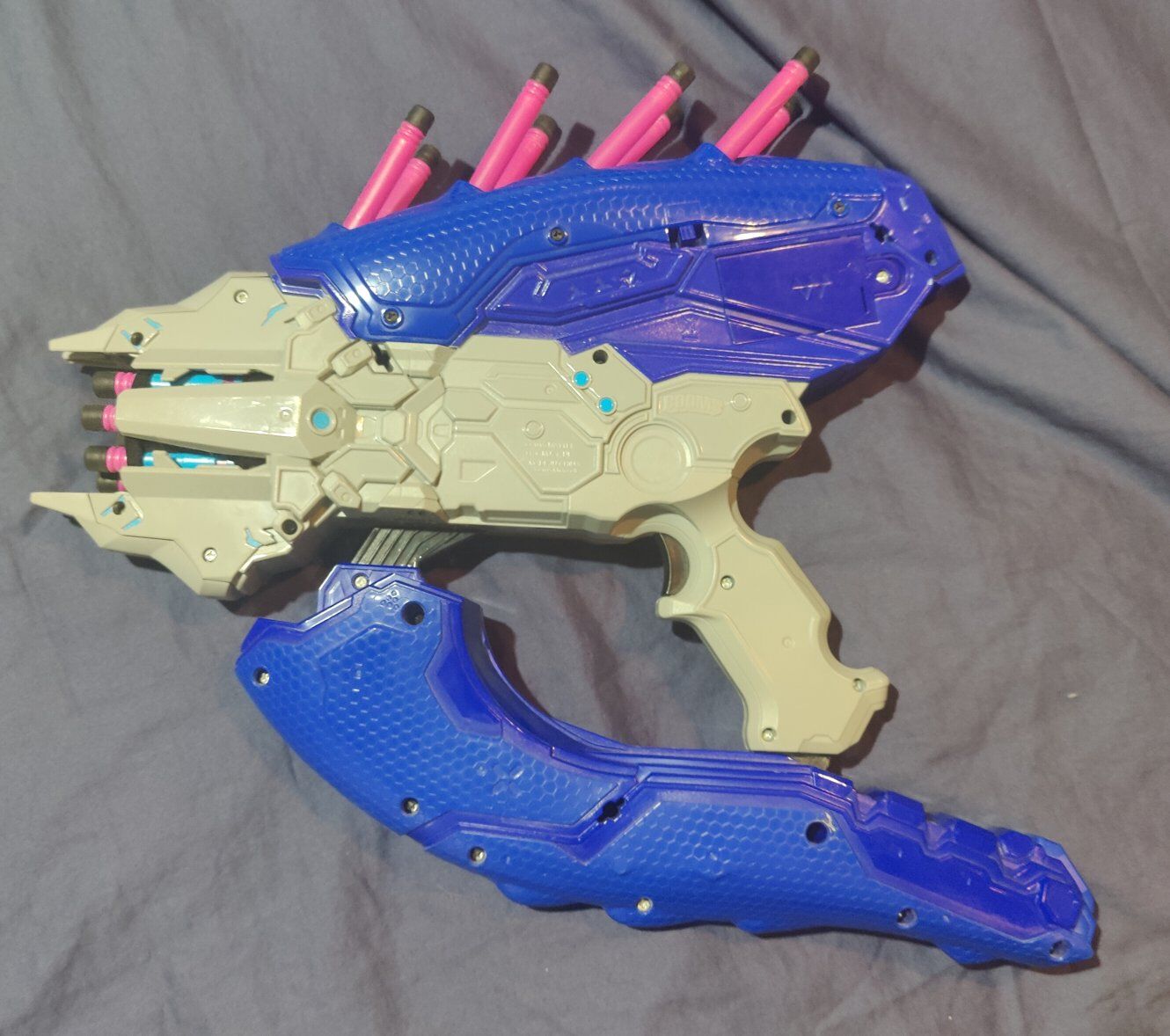 a nerf like blaster made by the company BoomCo. it uses plastic darts instead of foam ones. the darts on top do light up and it does still work. however it's missing a one dart. it's a little dusty and some of the darts have been bent but they still work completely fine.