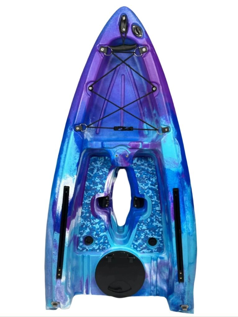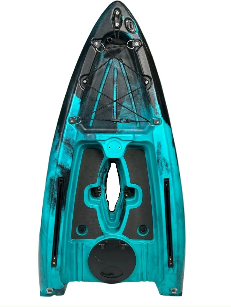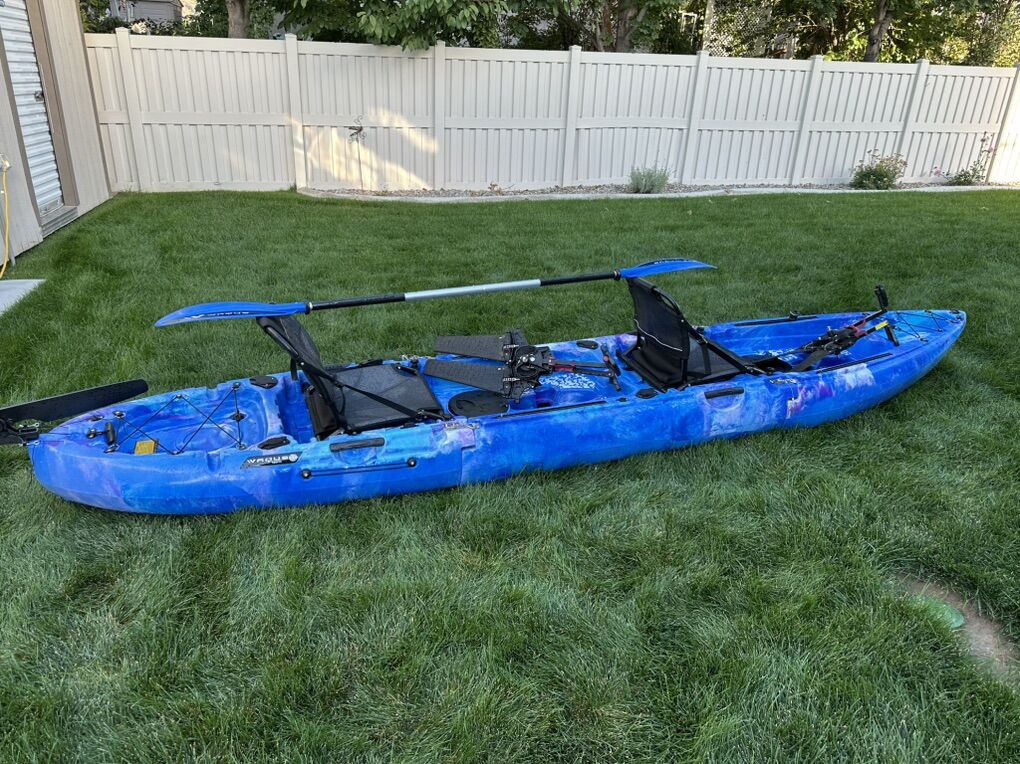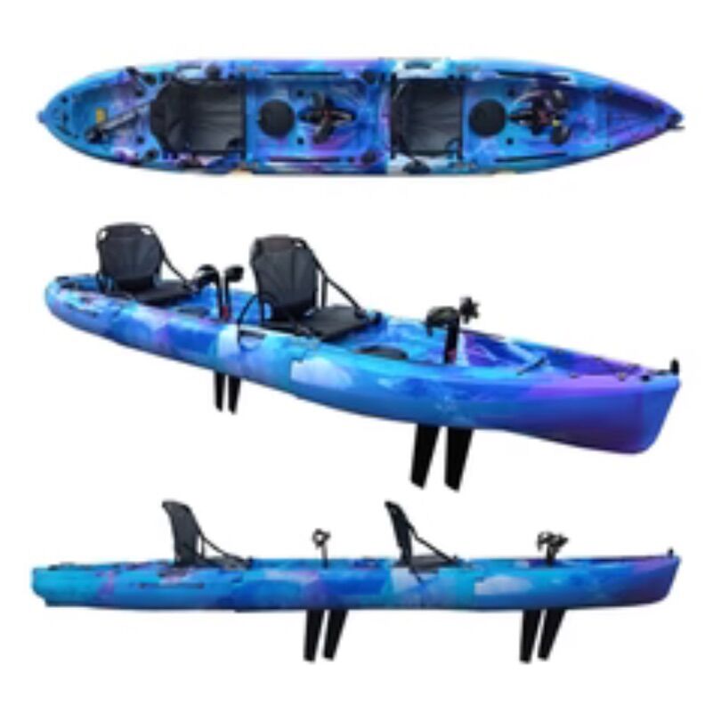 The Low Rider Tandem is suitable for 1 or 2 occupants and has a total length of 13.5 feet, with 3 separate pieces that weigh approximately 38 pounds each (115 pounds in total). With a maximum load of 485 pounds and a lower, narrower, and lighter design, this kayak is not recommended for standing. You can easily switch from a 2 person configuration to a 1 person configuration in less than 2 minutes. It is a popular choice for various water activities, such as touring and fishing, and offers ample storage space on the bow and stern for a dry bag, cooler, and other essentials. The convenient semi-dry well in front of the seat is perfect for storing a wallet, cell phone, and keys. Additionally, the kayak is equipped with 2 of our Waque Turbo Fin drives for efficient and non-fatiguing propulsion. The outdoor fabric seats are quick-drying, ensuring many enjoyable hours on the water. Its modular design allows for easy storage, transportation, and assembly. This fishing-ready kayak also features built-in rod holders and track mounts for attaching accessories. We also have demo models of our Solo Low Rider (2 section modular, can add center section for tandem later) for only $895.