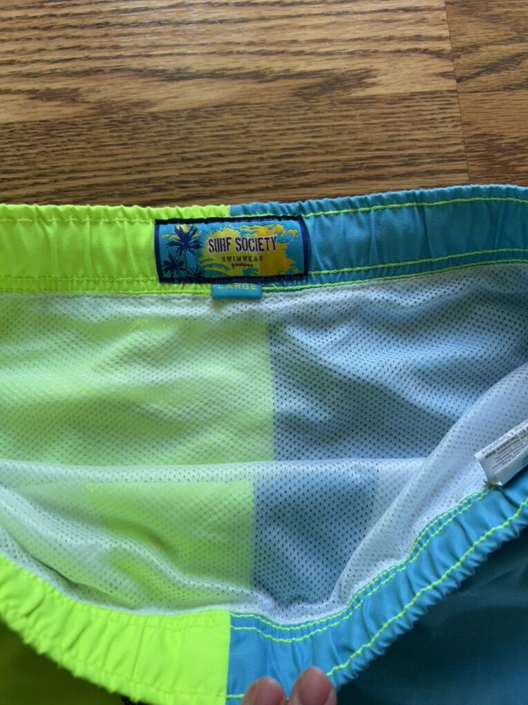 VenmoLike new men’s surf Society swimwear in size large. Beautiful turquoise blue with neon yellow. 6 inch inseam. Two side pockets and one rear pocket. Mesh lining. Elasticated waist with drawstring. Clean smoke free. No stains, flaws, defects or snags. Cash or Venmo. Pick up from Alpine.