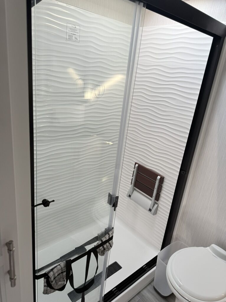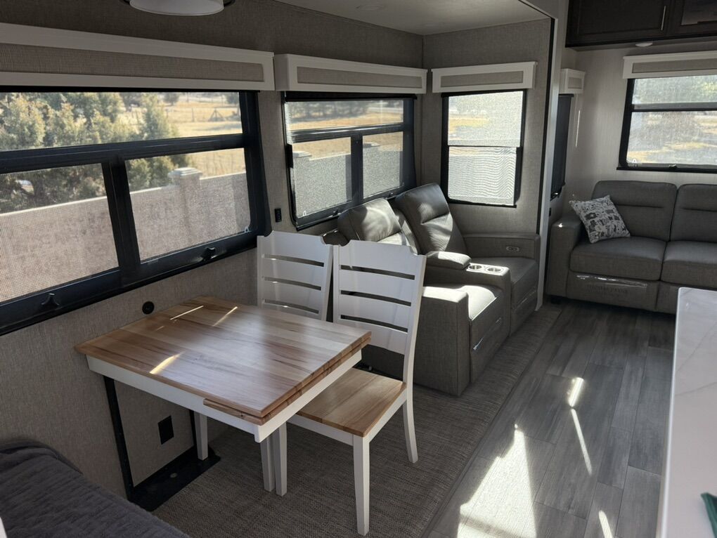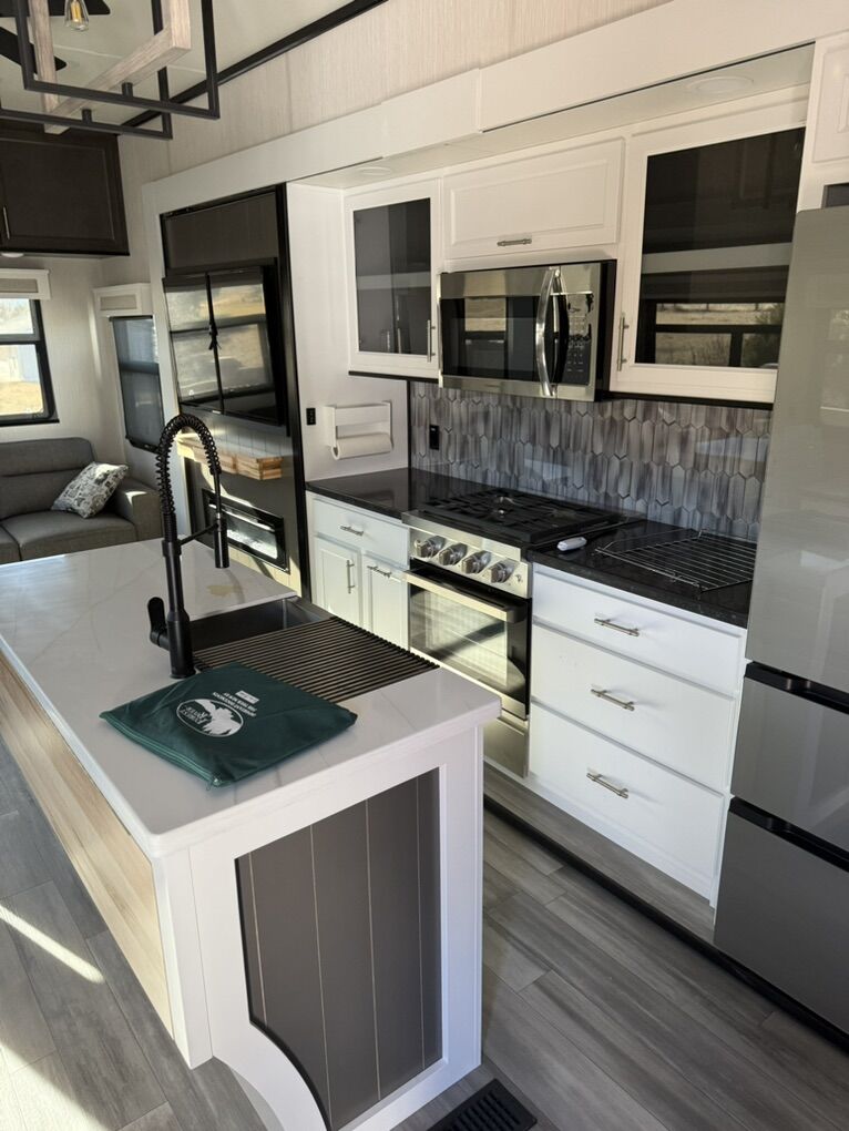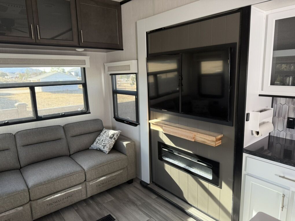 Forest River Cedar Creek fifth wheel 360RL highlights: Rear Living Area Kitchen Island Fireplace Dual Sink Vanity Front Private Bedroom You can bring a guest or two to join in on the fun with this fifth wheel! The rear living area has a hide-a-bed sofa and power theater seating across from an entertainment center with a fireplace and a Murphy pantry hidden behind. The chef can prepare their best meals with the kitchen island and your guests will love the fold-down breakfast counter. The full bathroom has a spacious shower with a seat plus a dual sink vanity for convenience. The king bed slide in the front private bedroom welcomes you to enjoy a good night's rest and the front wardrobe has storage shelves and washer/dryer prep if you want the option to wash clothes while you're away from home! With any Cedar Creek fifth wheel by Forest River, you will find a quality-built RV with your comfort in mind! The all-aluminum super structure on 16 centers or less will provide a solid foundation to your fifth wheel, and the VIXENITE waterproof composite slide floors will hold up over years of use. Each model also includes black textured metal skirting, a TST tire pressure monitor system, and Cradlepoint Day 1 Wi-Fi connectivity so you can stay connected while you camp. A Lippert Gen 3 Leveling System makes setting up camp easier than ever, and the 200 watt solar panel means you can enjoy some off-grid capabilities. Head inside to find upgraded solid surface countertops, floating steps to the upper deck, USB ports, and updated backsplash that is modern and eye-catching. You will also enjoy new in-wall storage in the bedroom for books or personal belongings, a new V-Flo cordless vacuum for easy clean up, a redesigned shower with LED lighting and a fold-down bench, and many more luxuries! SleeperSize: King
