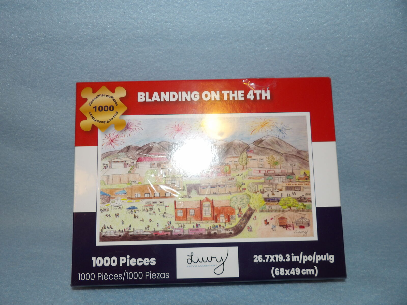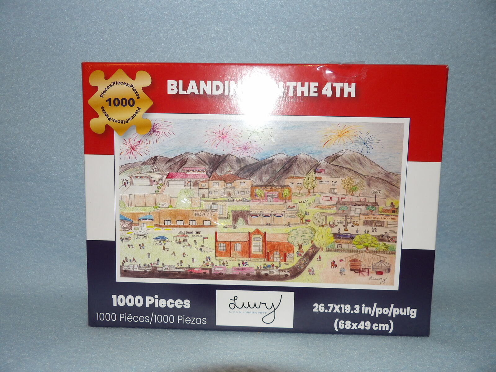 1,000-piece jigsaw puzzle with fun artistic rendering of the city of Blanding in Utah for the town's Independence Day celebration. New in package.