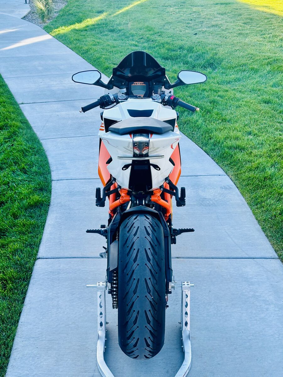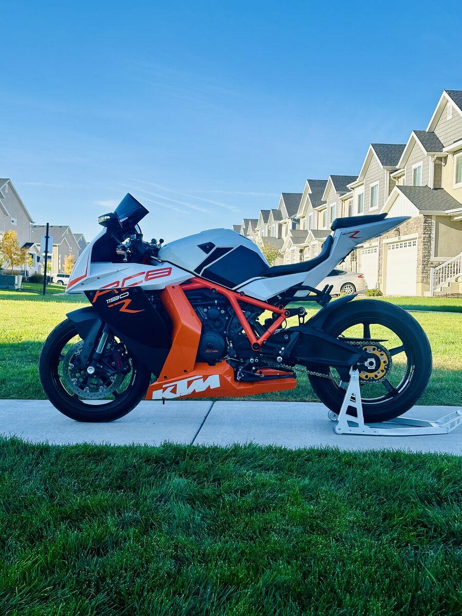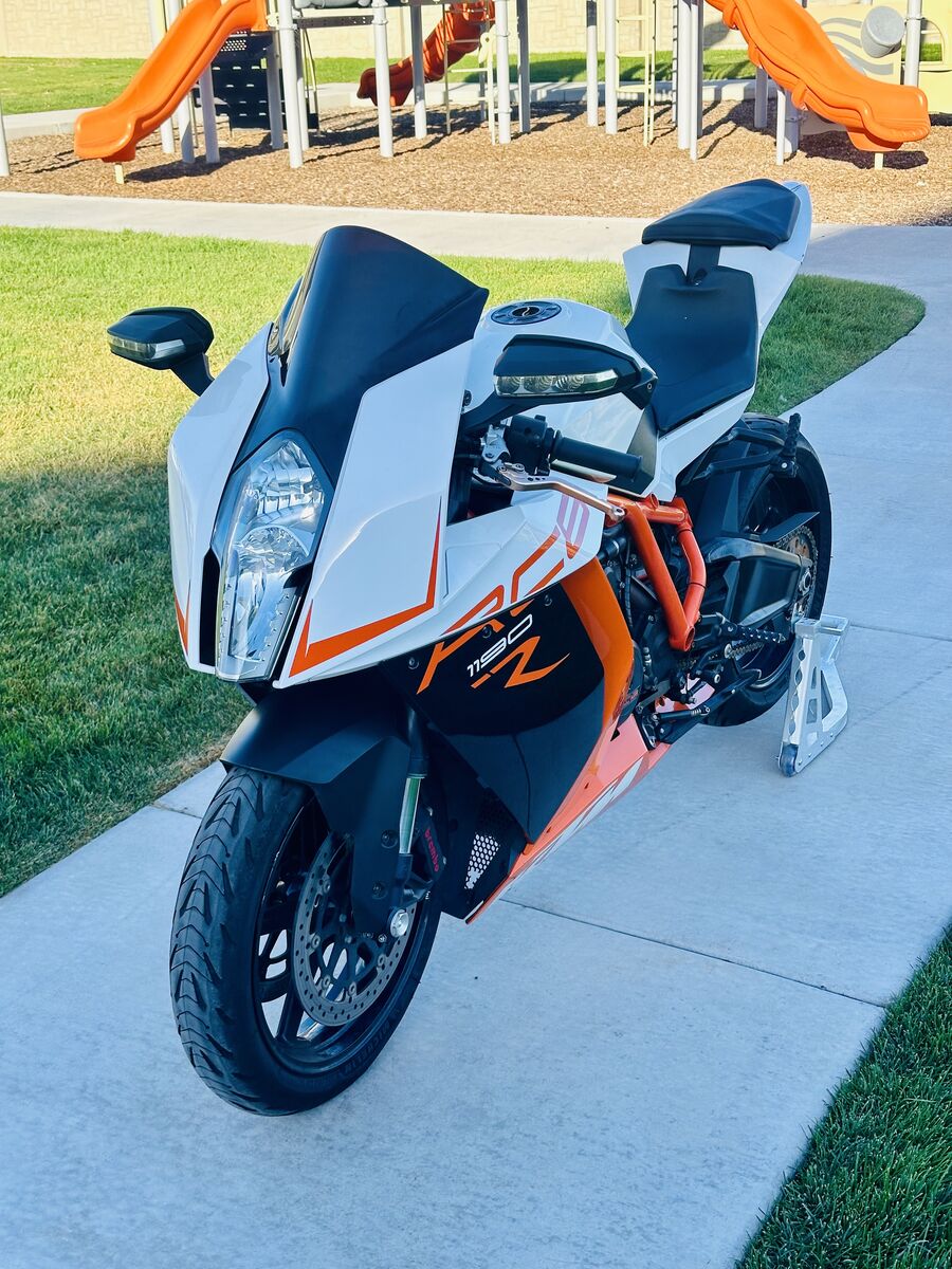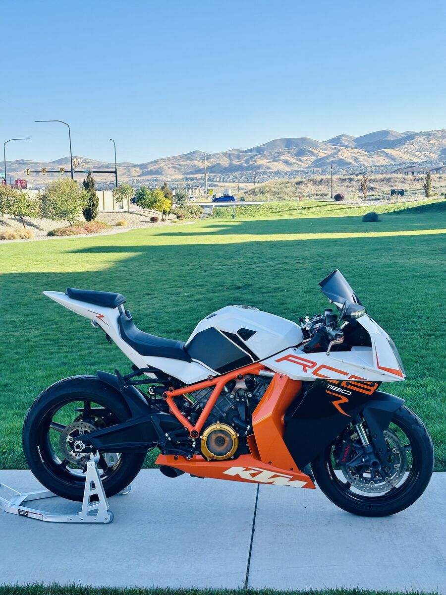 Its my KTM 1190 RC8 R. Almosg everything on this bike is Adjustable inckuding frame, subframe, rearsets, clipons etc. From factory it comes with brembo breaks and wp suspension. Aftermarket Jester exhaust (sounds crazy good), clear clutch cover, supersprox sprockets ( -1 front/ +2 rear) gearing is a little extreme, quickshifter, new tires with around 800 miles, double bubble windshield, clutch n break lever, fender eliminator kit, tank grips and AGM battery. Valve clearance check/adjustment and full service completed at 13k miles. Bike currently have 16k miles and did a full fluids flush (break fluid, coolant and engine oil with filter) like under 100 miles ago. Clean title in hand.
