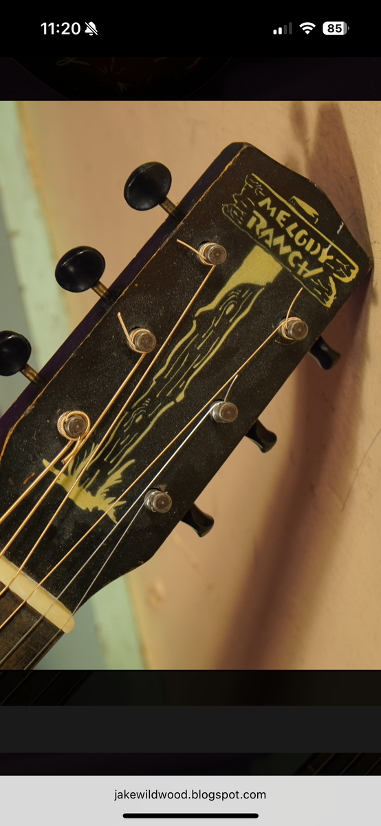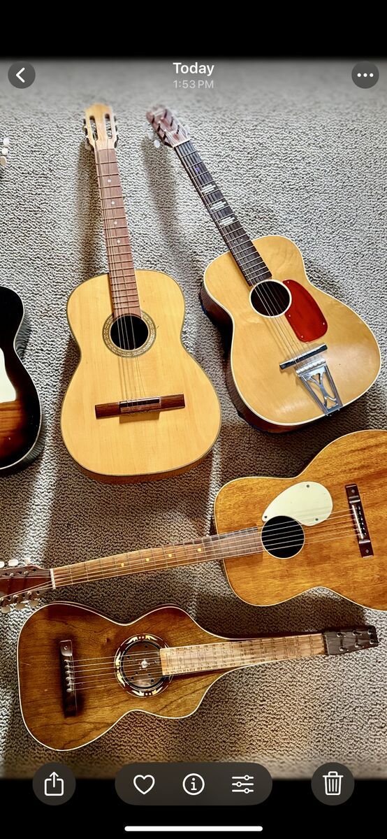 Antique Stella harmony parlor guitar, Stella guitar, Kay guitar, unmarked parlor guitar and Hawaiin school of music laptop weisenborn slat key guitar and a ratify 1940's Gene Autry Melody Ranch guitar