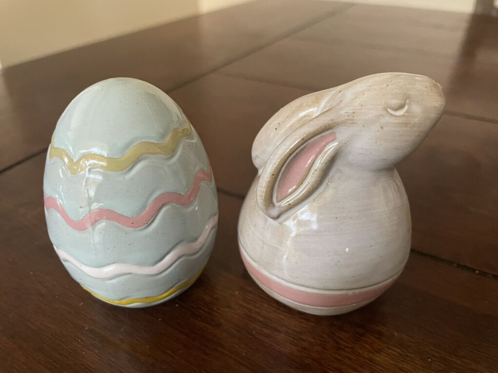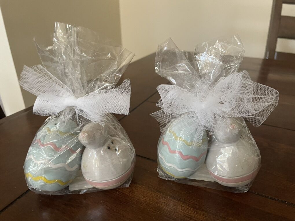 I have 2 new sets of Easter salt and pepper shakers. Each set has one Easter egg and one bunny rabbit. They are ceramic and have plastic plugs in the bottom. They are 3 inches tall. The price tags show that each set was originally $21.95. I’m asking $6 for each set or take both of them for $10. See my other ads for jewelry, artwork, home decor and more.